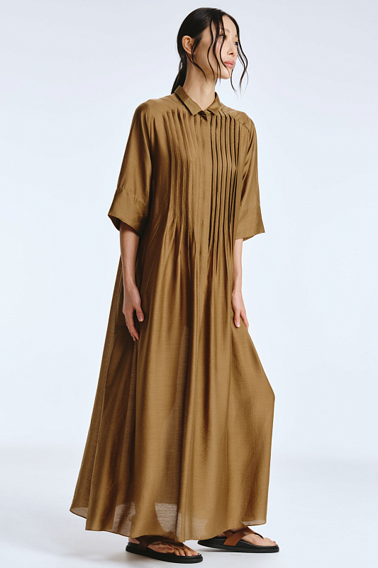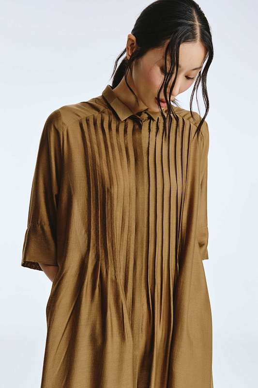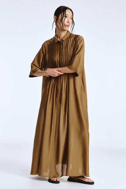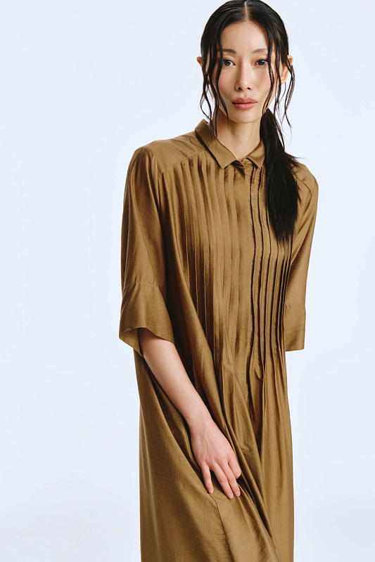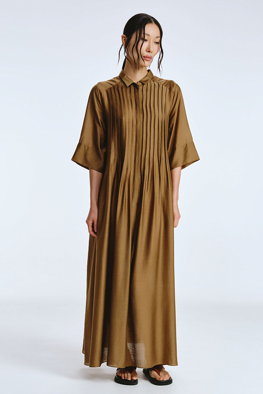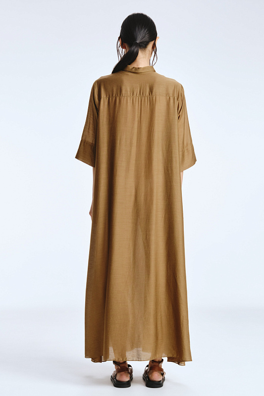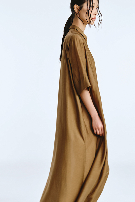 Невероятное легкое платье-рубашка летящего силуэта выполнено из микромодала с добавлением шелка. Длинное, свободное, как символ высокого статуса. Классический крой всегда остаётся в тренде благодаря всё новым и новым идеям дизайнеров. Длина рукава весьма комфортная, двойной слой ткани завершает рукав и придает законченность. Маленькие пуговицы, скрытые под планкой, и рубашечный ворот поддерживают классику образа. Защипы от линии плеча по переду пикантно скрывают скульптурность тела. От условной линии талии защипы расходятся и придают динамику при ходьбе. Вместительные карманы — не просто декор, это комфорт и удобство. Скрытый крой карманов не добавляет лишнего объема, сохраняя чистоту линий. Это платье-рубашка для тех, кто устал от скучных базовых моделей и хочет добавить в гардероб «изюминку».