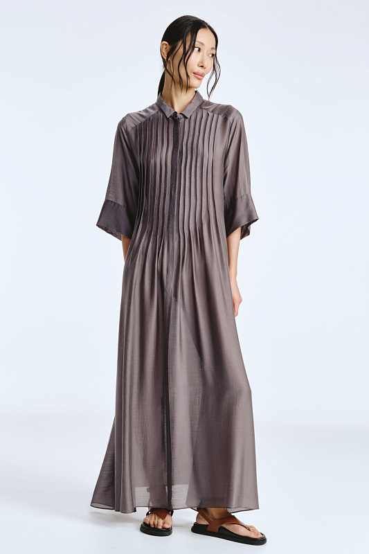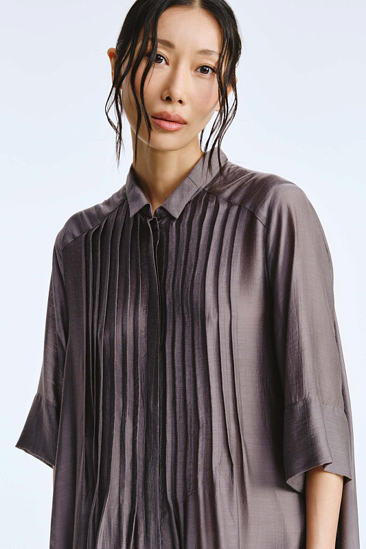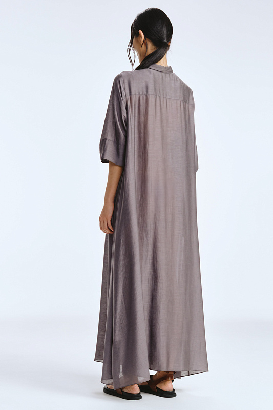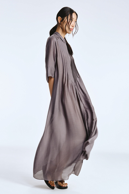 Невероятное легкое платье-рубашка летящего силуэта выполнено из микромодала с добавлением шелка. Длинное, свободное, как символ высокого статуса. Классический крой всегда остаётся в тренде благодаря всё новым и новым идеям дизайнеров. Длина рукава весьма комфортная, двойной слой ткани завершает рукав и придает законченность. Маленькие пуговицы, скрытые под планкой, и рубашечный ворот поддерживают классику образа. Защипы от линии плеча по переду пикантно скрывают скульптурность тела. От условной линии талии защипы расходятся и придают динамику при ходьбе. Вместительные карманы — не просто декор, это комфорт и удобство. Скрытый крой карманов не добавляет лишнего объема, сохраняя чистоту линий. Это платье-рубашка для тех, кто устал от скучных базовых моделей и хочет добавить в гардероб «изюминку».