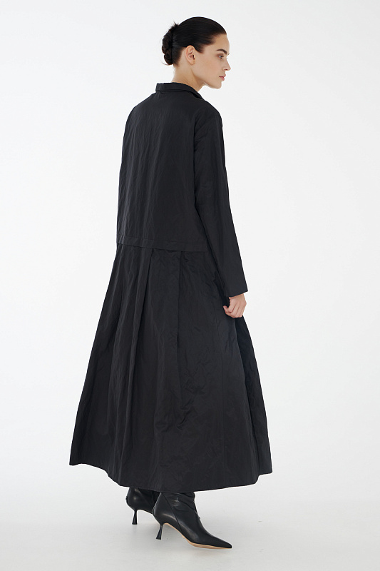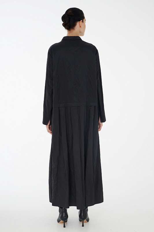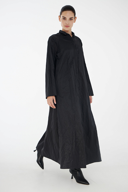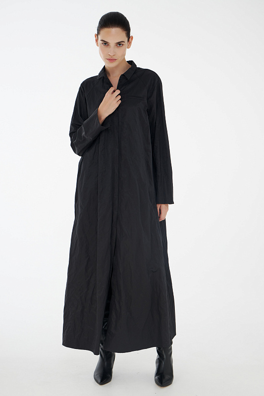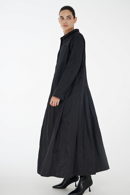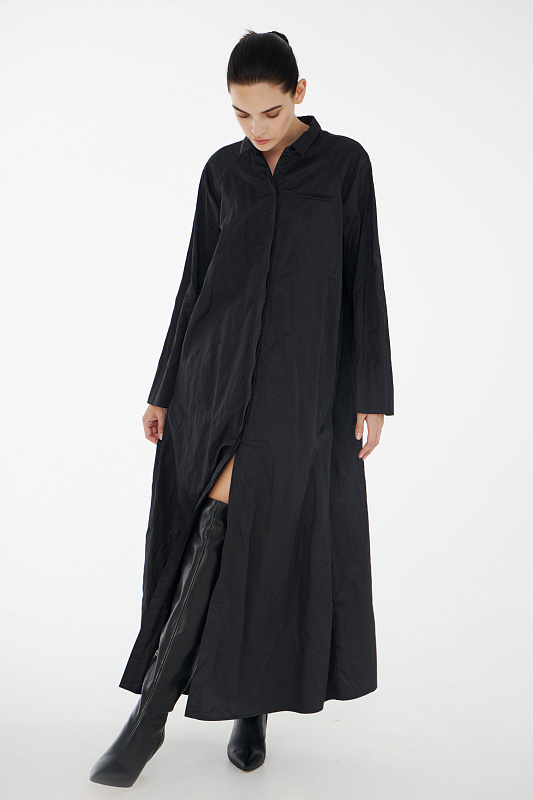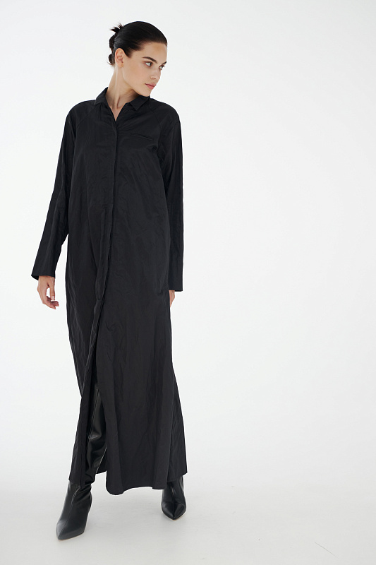Фасон платье-рубашка придумала легендарная Коко Шанель, которая активно внедряла в женскую моду элементы мужского стиля. Верхняя часть платья повторяет конструкцию рубашки: потайная застёжка на маленькие пуговицы под планкой, аккуратный рубашечный ворот, нагрудный прорезной фальш - карман. Рукав реглан без классической проймы придает исключительную мягкость и делает линию плеч закругленной. Нижняя часть платья в складку придает ему немного кокетливости. Линия талии находится несколько ниже её обычного расположения. Дополнительный плюс - несминаемость из-за структуры ткани с рельефным рисунком.