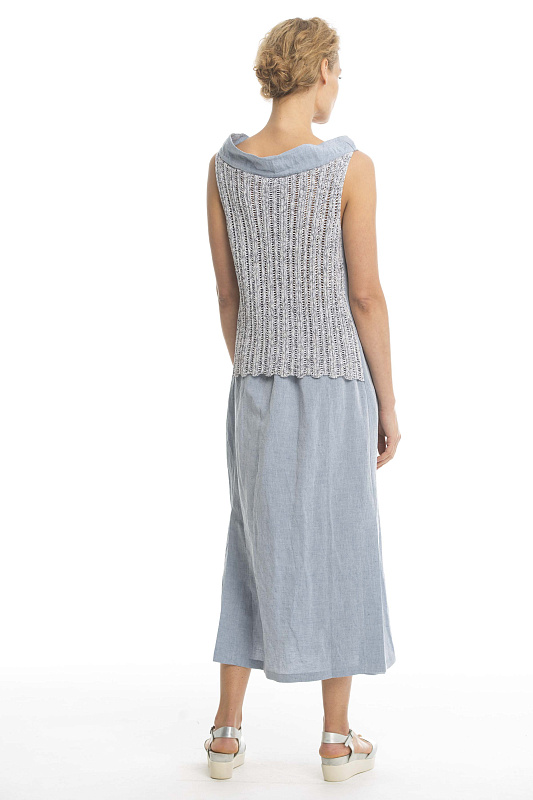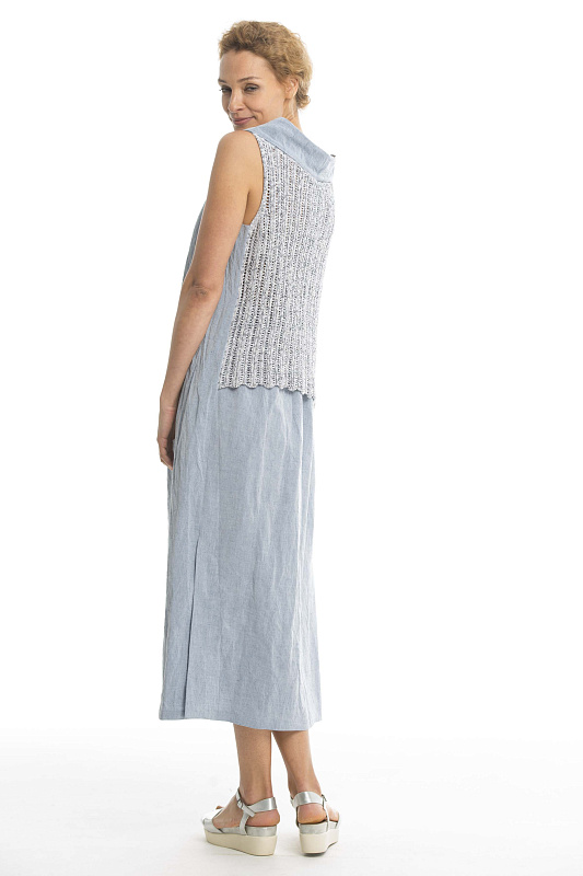 Платье льняное без рукавов. Прямая модель, отлетная вязанная ажурная спинка, воротник мягкая стойка хомут.