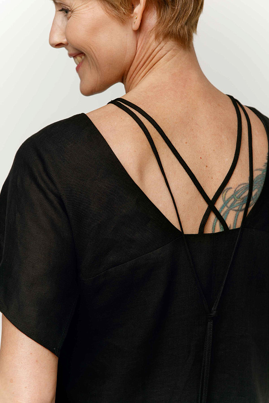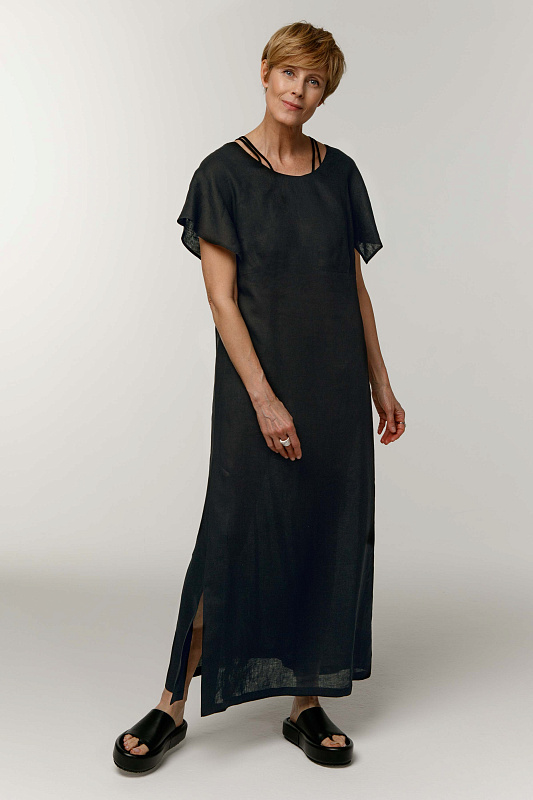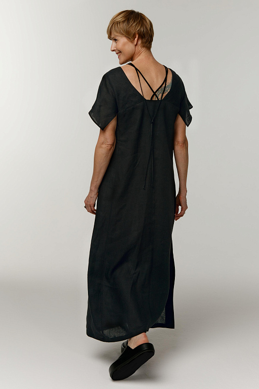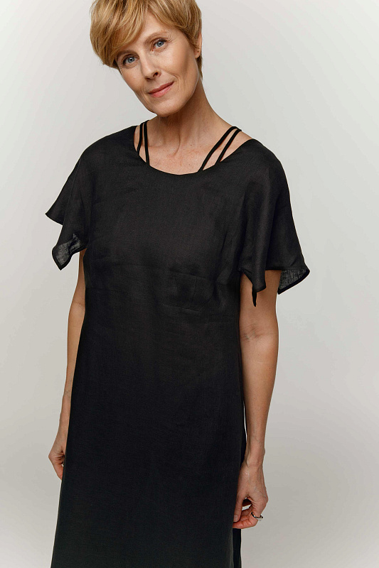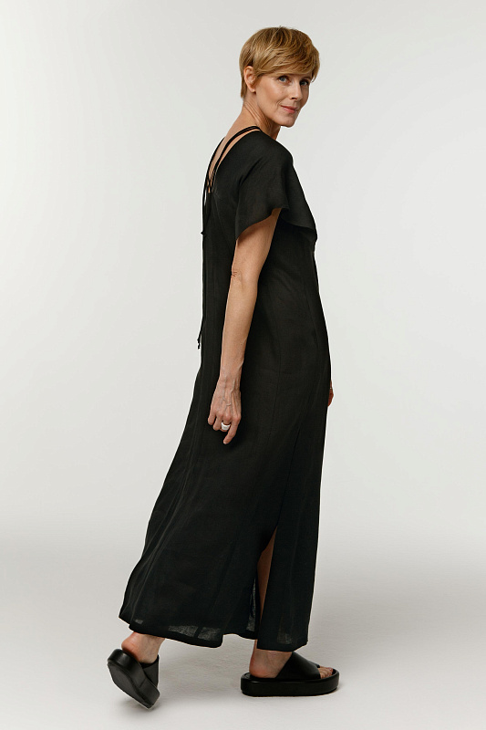 Харизматичное платье с эффектными крылашками выполнено из тонкого льна. Отрезная кокетка визуально вытягивает силуэт. Деликатный разрез по низу. Удобные карманы. Оригинальная деталь - шнуровка по спинке напоминает технику макраме.