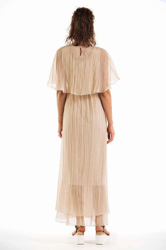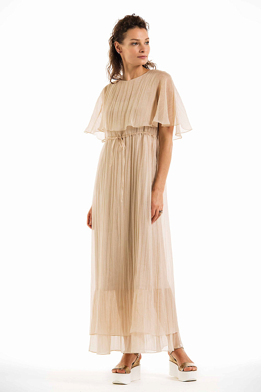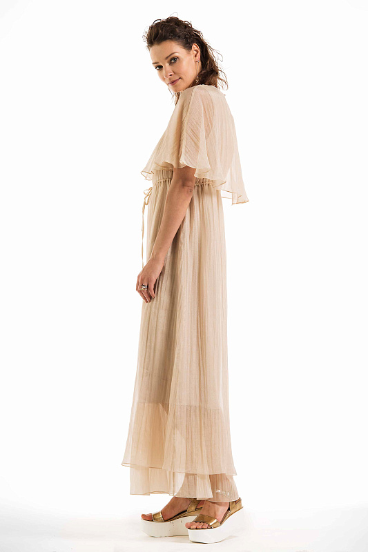 Длинное платье А-силуэта, без рукавов, на кулиске, благодаря ткани, из которой сшита модель (жатка-вуаль), платье выглядит легко и роскошно, а пелерина добавляет образу женственности и нежности.