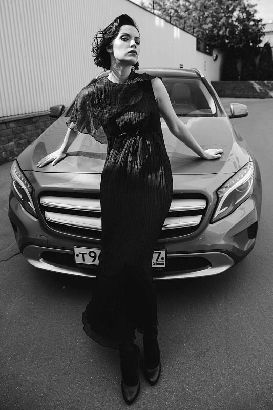 Длинное платье А-силуэта, без рукавов, на кулиске, благодаря ткани, из которой сшита модель (жатка-вуаль), платье выглядит легко и роскошно, а пелерина добавляет образу женственности и нежности.