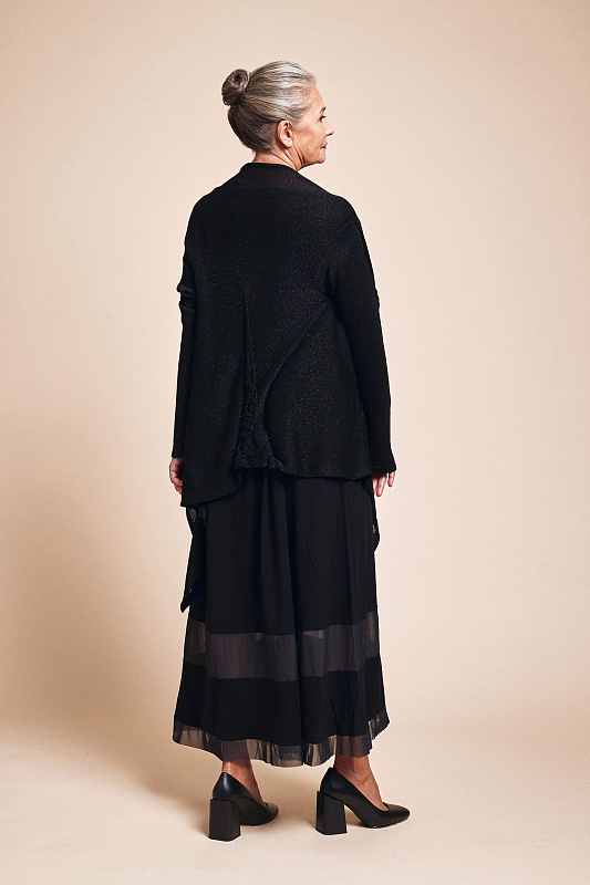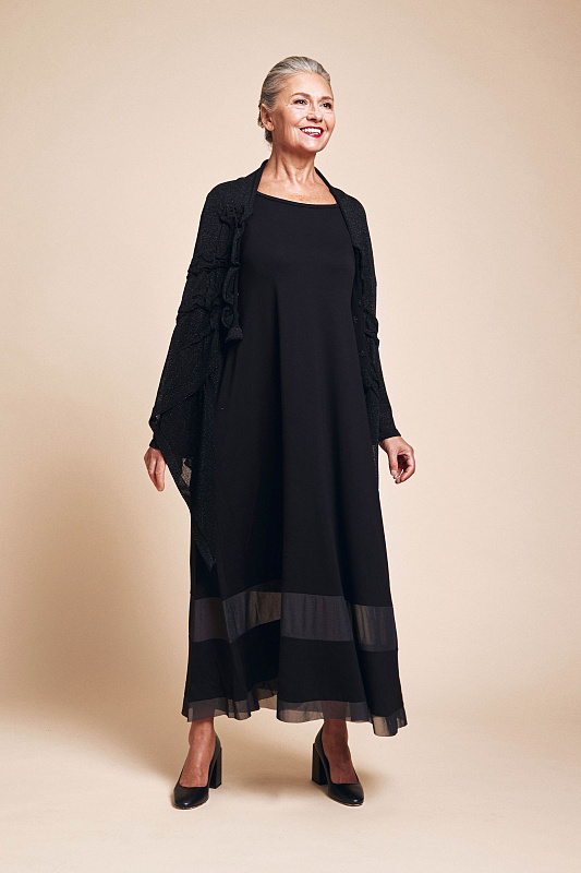 Длинное трикотажное платье А-силуэта с круглым вырезом горловины. Длинный рукав, оригинальный низ изделия дополнен вставками из сетки. Выполнена из мягкой и нежной вискозы с небольшим содержанием эластана, что делает эту модель очень комфортной в носке.