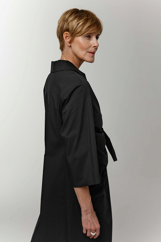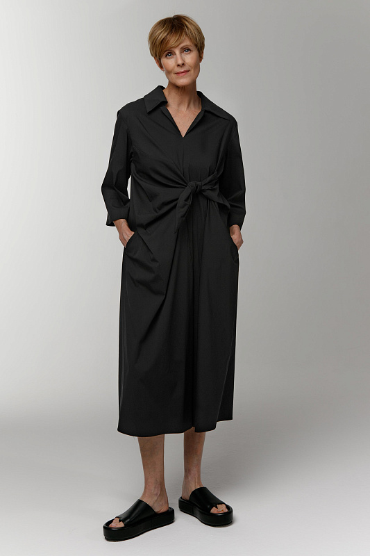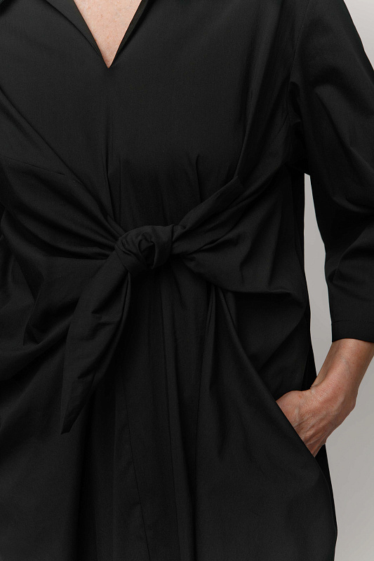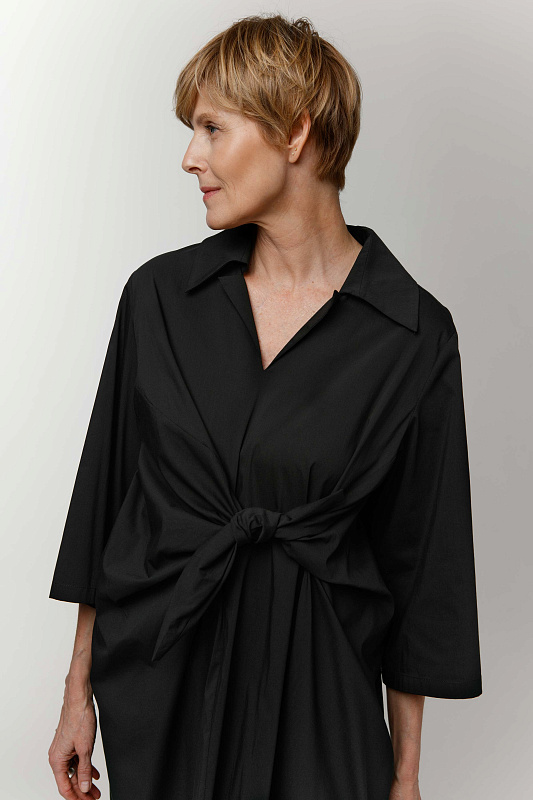 Комфортное платье оригинальной дизайнерской конструкции из хлопка с эластаном. V-образный вырез. Отложной воротник на отрезной стойке. Рукава 3/4. Прорезные карманы. Эффектная деталь - завязка-узел.