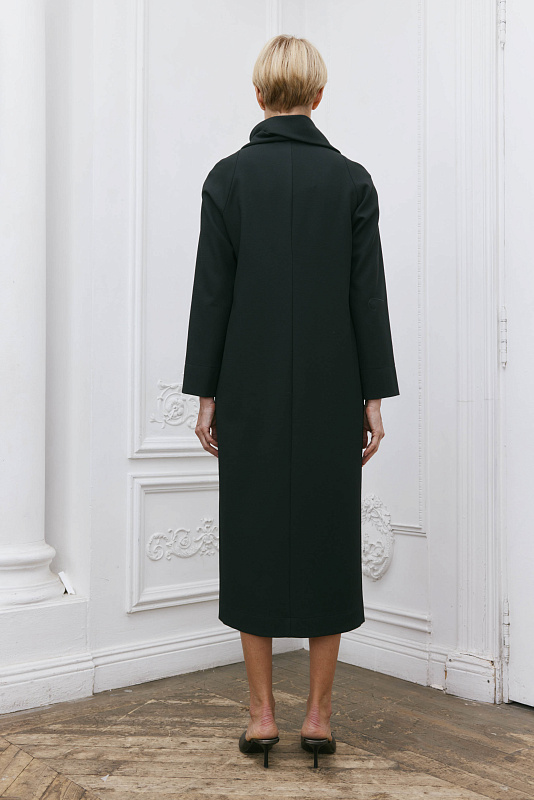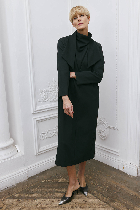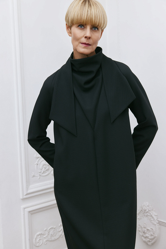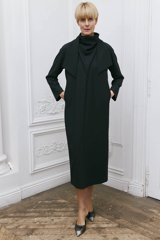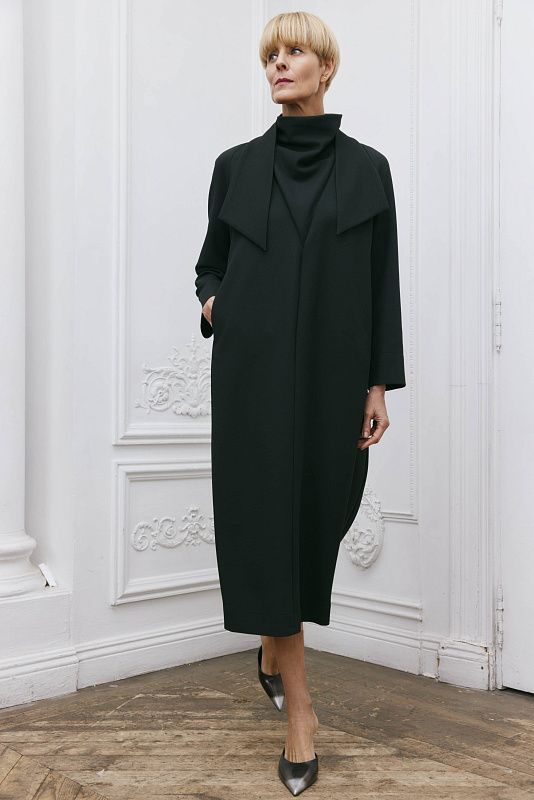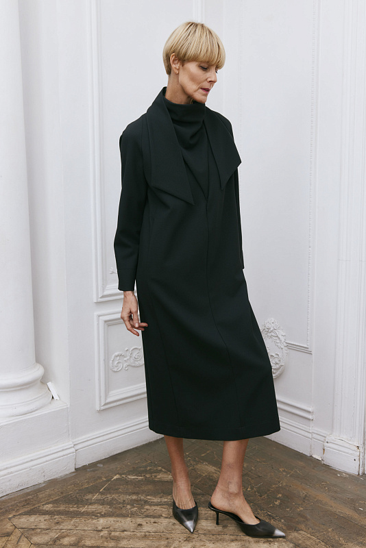 Платье свободного кроя с комфортной мягкой посадкой. Зауженная линия плеча — актуальный дизайнерский прием кроя, который фиксирует внимание на изящности шеи и рук, создавая женственный и элегантный образ. Акцентная деталь — драпировка ворота, скроенного V-образно в виде качелей. Продолжение ворота мягко спадает по спинке, словно тёплое объятие рук. Чёрный цвет всегда выглядит роскошно и дорого. Карманы ловко замаскированы в швах. Уникальная фактурная ткань — результат гармоничного союза вискозы и нейлона.