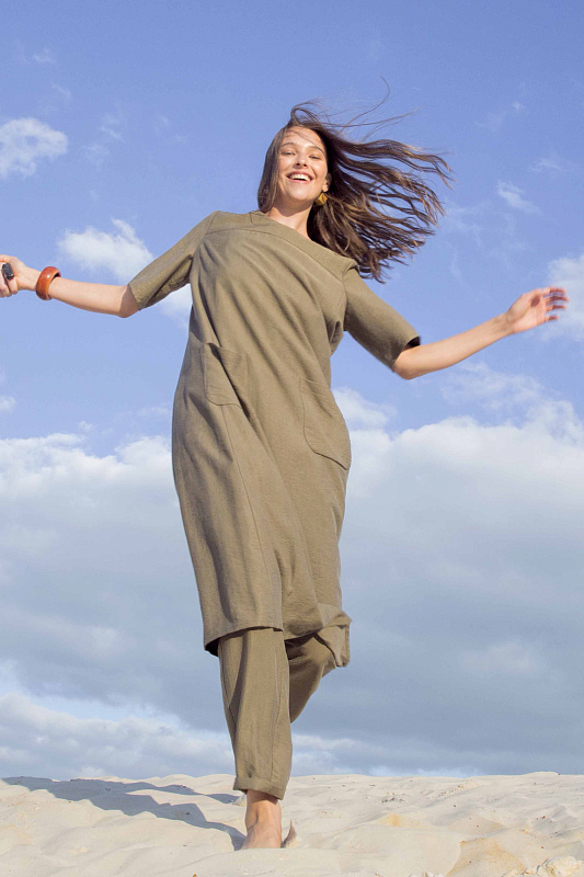 Платье оригинальной дизайнерской конструкции А-силуэта. Накладные карманы, круглый вырез горловины, втачной рукав. Модель выполнена из уникальной ткани нового поколения – тенсель, – экологически чистого, очень прочного , дышащего и не вызывающего аллергию материала, который изготавливают из древесины австралийского эвкалипта.