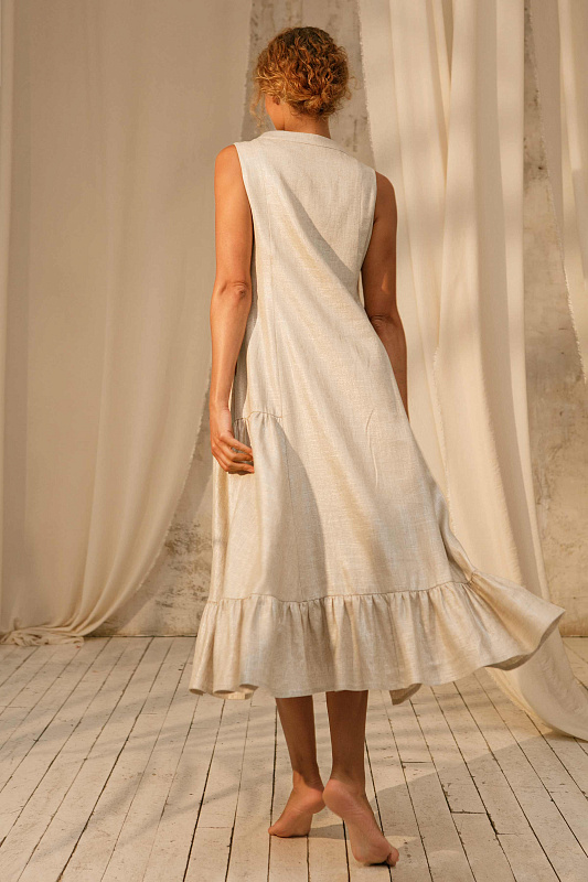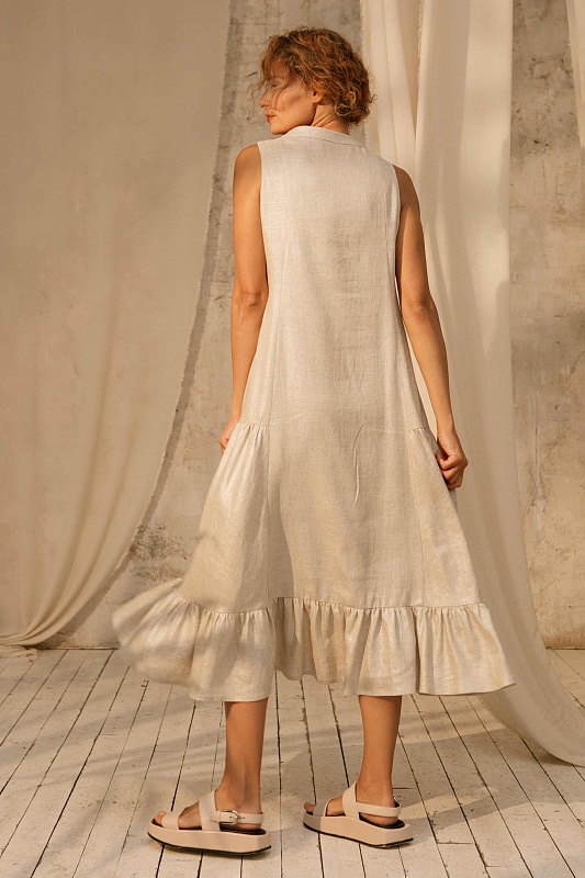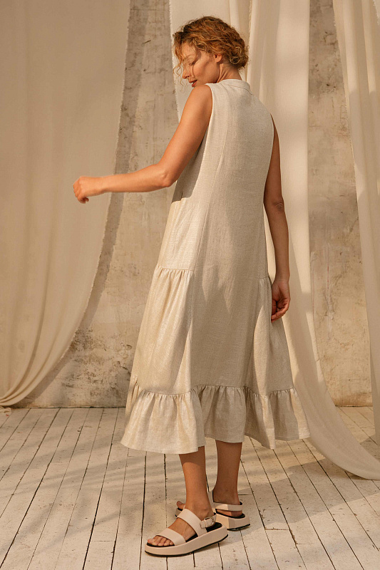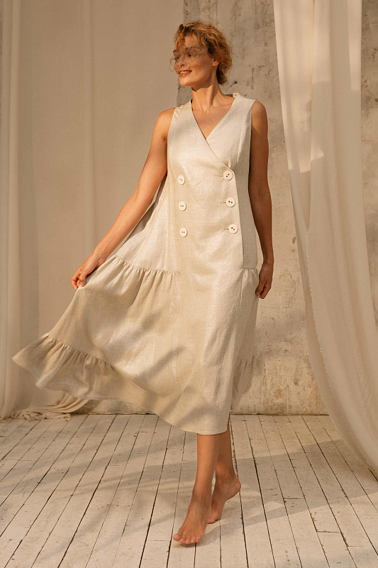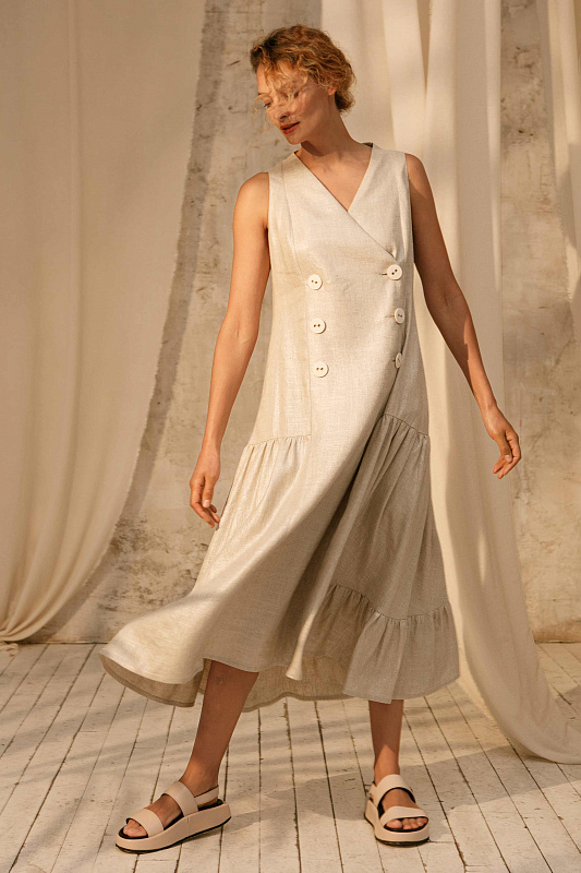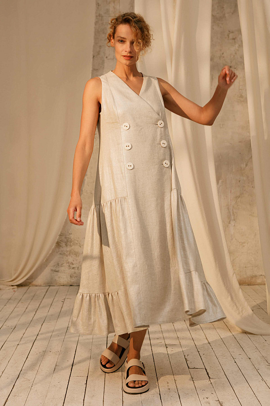 Трендовый сарафан без рукавов оригинального кроя. Застежка на больших оригинальных пуговицах. Карманы в боковых швах. Модель выполнена изо льна с очень деликатным блеском. Подклада- нежнейшая вискоза.