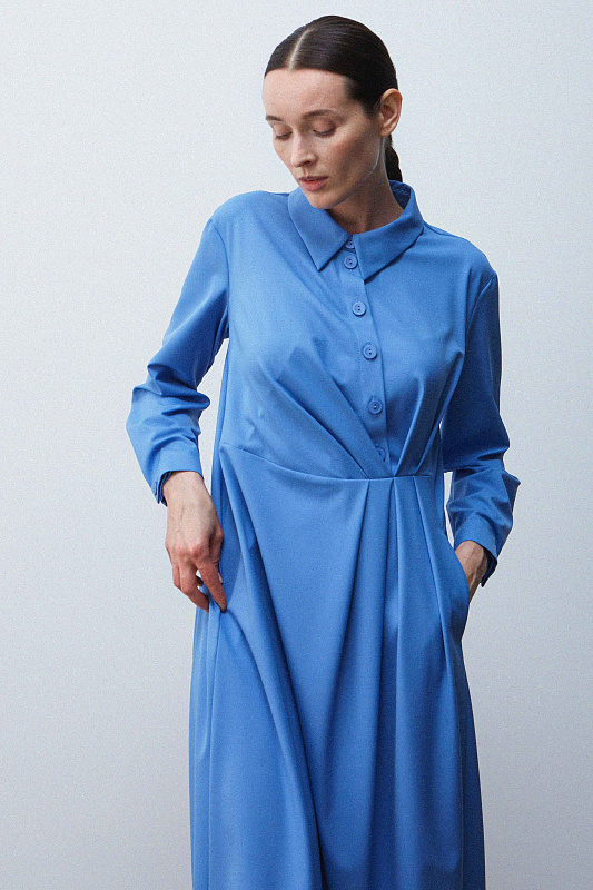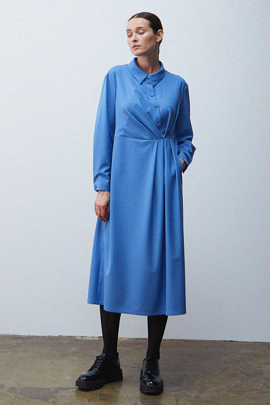 Оригинальное платье с асимметричной планкой на пуговицах. Манжет рукава на пуговице. Уникальная ткань нового поколения — керамика, оказывающая благотворное воздействие на здоровье, содержит антибактериальные вещества, препятствующие размножению бактерий и, как следствие, появлению запаха от одежды. Комфортная, пластичная ткань практически не мнется.