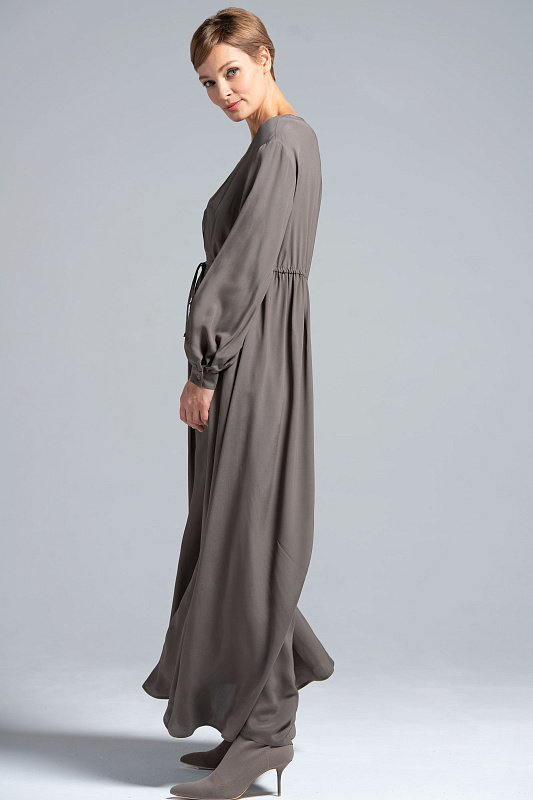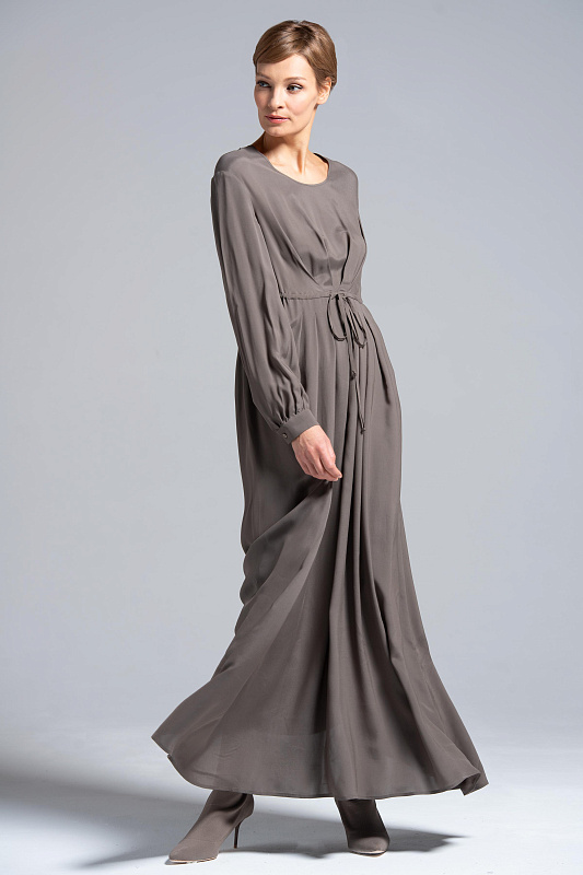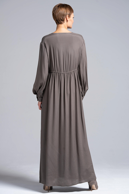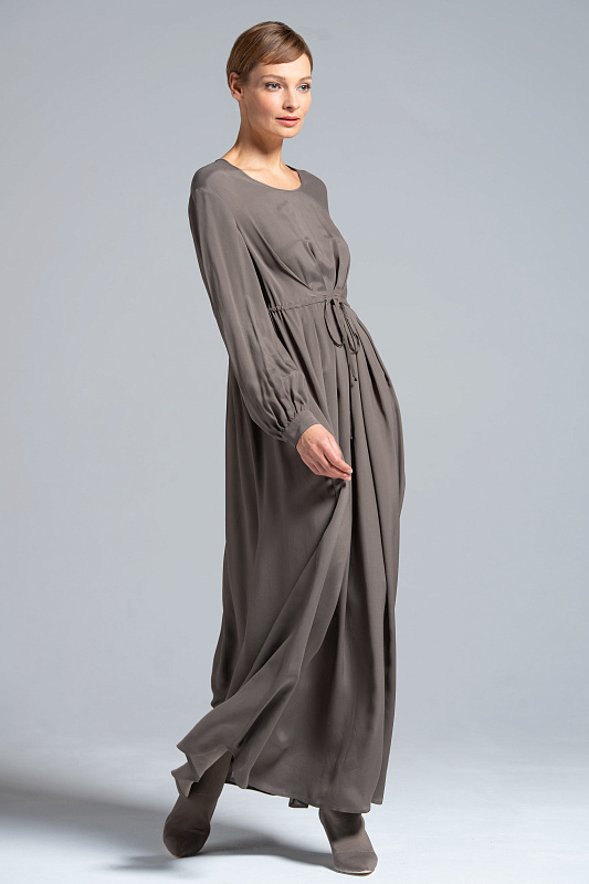 Нежное и воздушное длинное платье из вискозы А-силуэта на кулиске, с мягкими сборками. Спущенная линия плеча, длинный рукав Епископ, круглый вырез горловины. Манжеты на пуговицах.