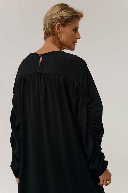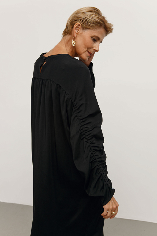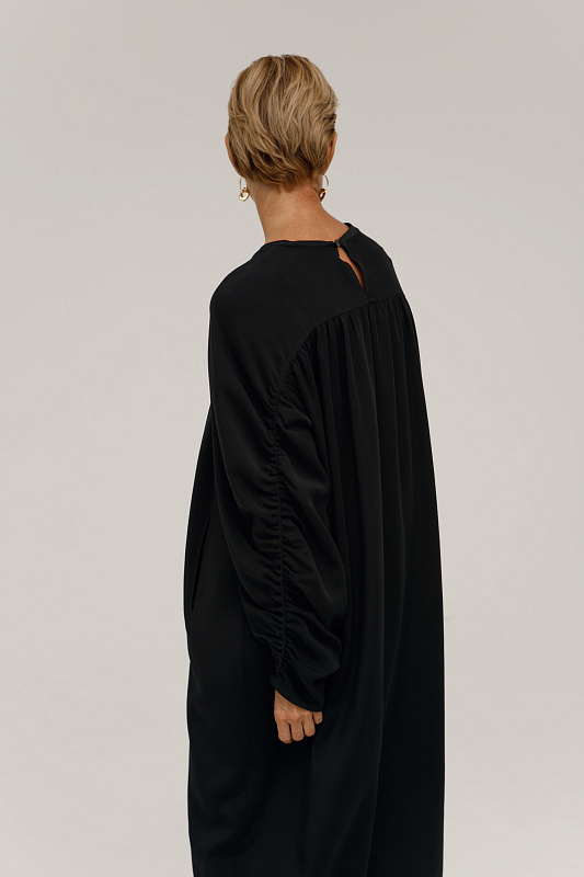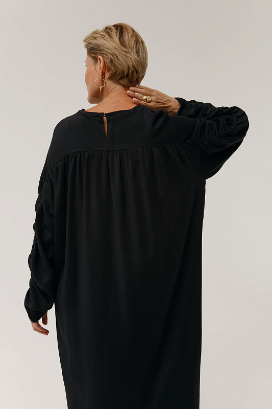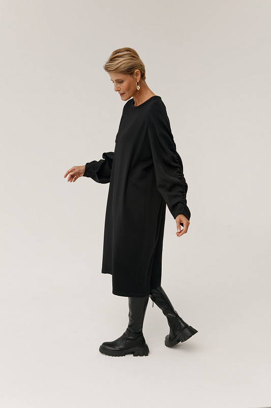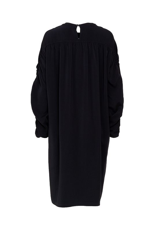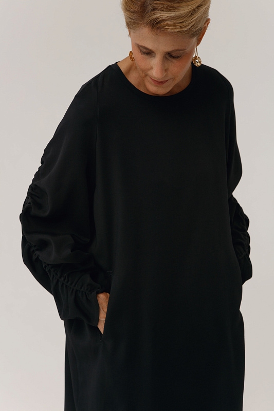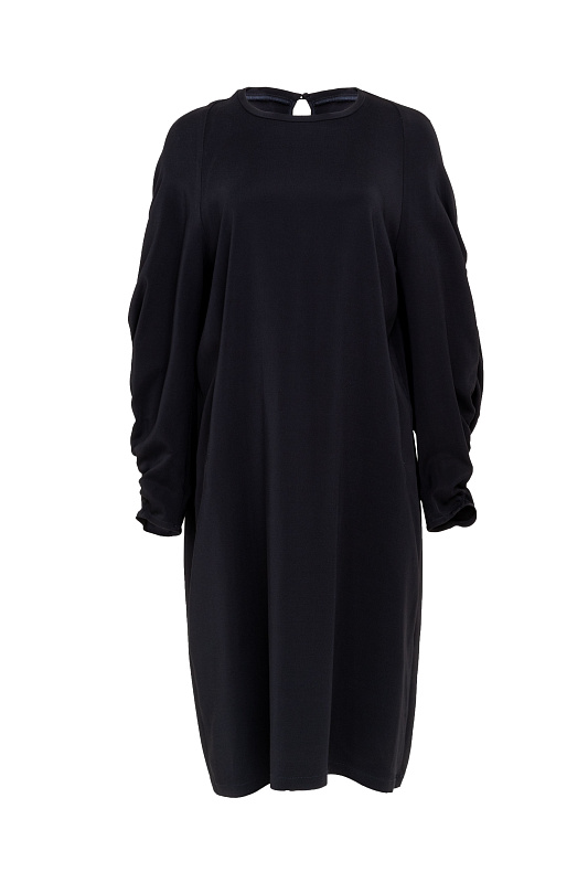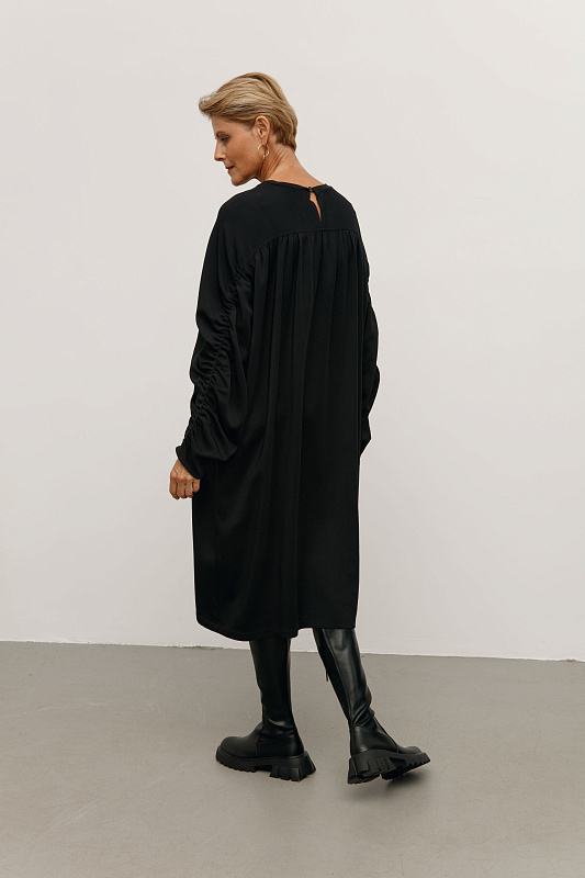 Концептуальное платье из плотной пластичной вискозы. По линии кокетки и рукава - оригинальная сборка. Круглый вырез горловицы. Застежка сзади на маленькую пуговичку. Прорезные карманы.