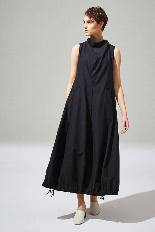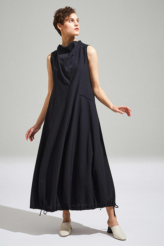 Длинное платье c оригинальным воротом «качели» треугольной формы и отрезным воротником-стойкой по спинке. Рельефы по переду и спинке, прорезные карманы, разрезы по боковым швам, низ изделия собран на кулису. Платье выполнено из мягкого комфортного хлопка, который хорошо держит форму.