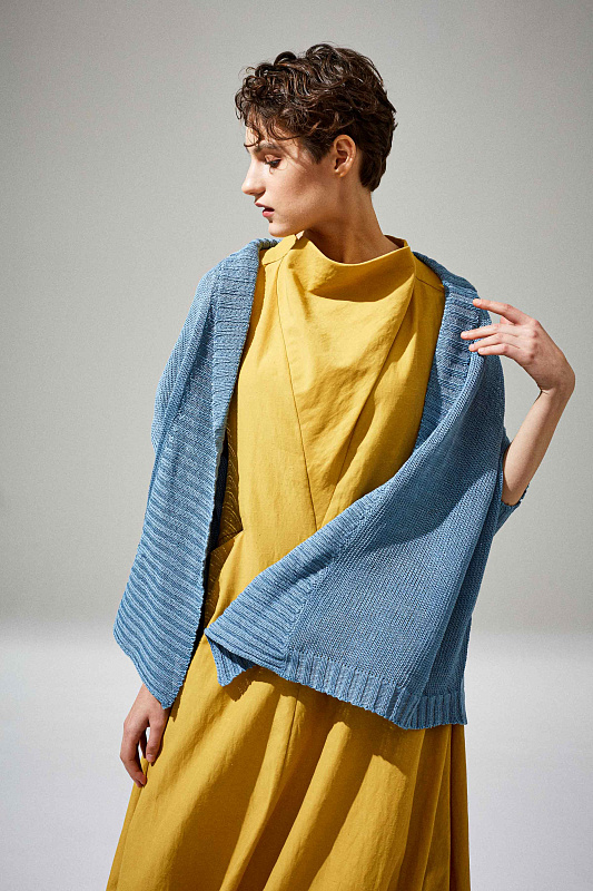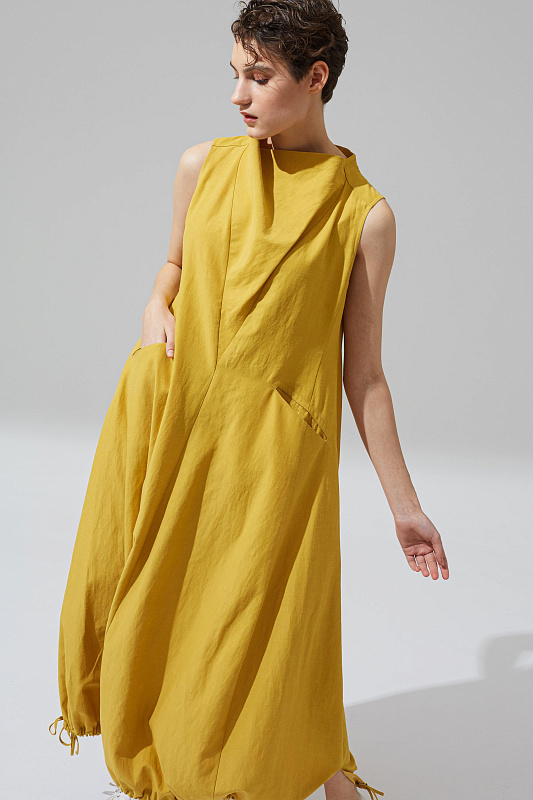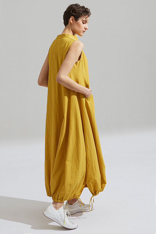 Длинное платье c оригинальным воротом «качели» треугольной формы и отрезным воротником-стойкой по спинке. Рельефы по переду и спинке, прорезные карманы, разрезы по боковым швам, низ изделия собран на кулису. Платье выполнено из мягкого комфортного хлопка, который хорошо держит форму.