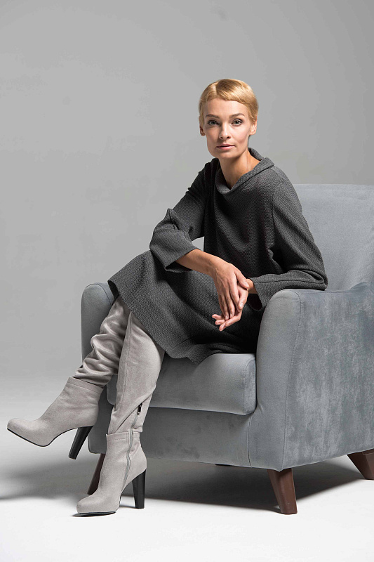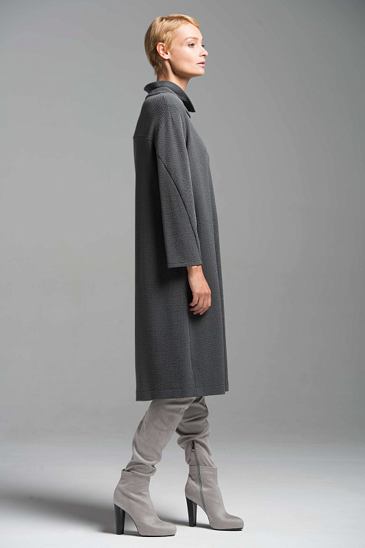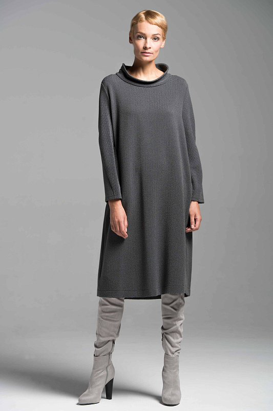 Платье со стойкой, прямой силуэт, спущенная линия плеча, сложный комбинированный рукав цельнокроеный с кокеткой по спинке и отрезной по переду. Платье из плотной и мягкой вискозы с эластаном позволит чувствовать себя комфортно и элегантно в условиях города.