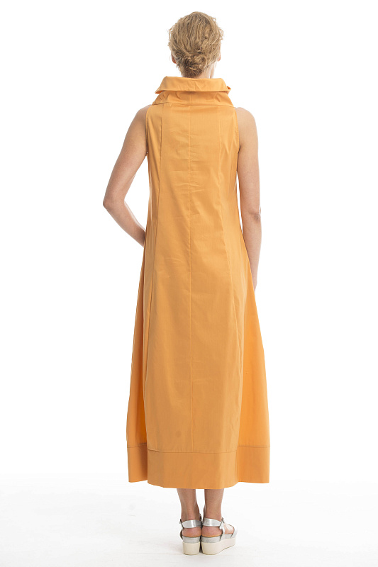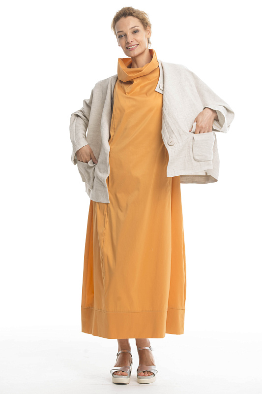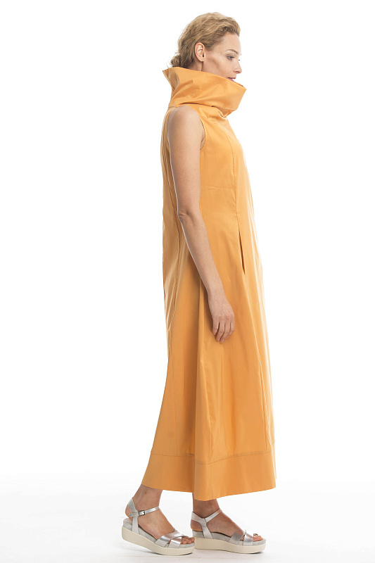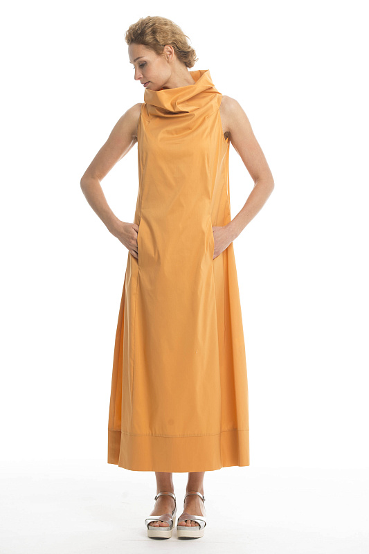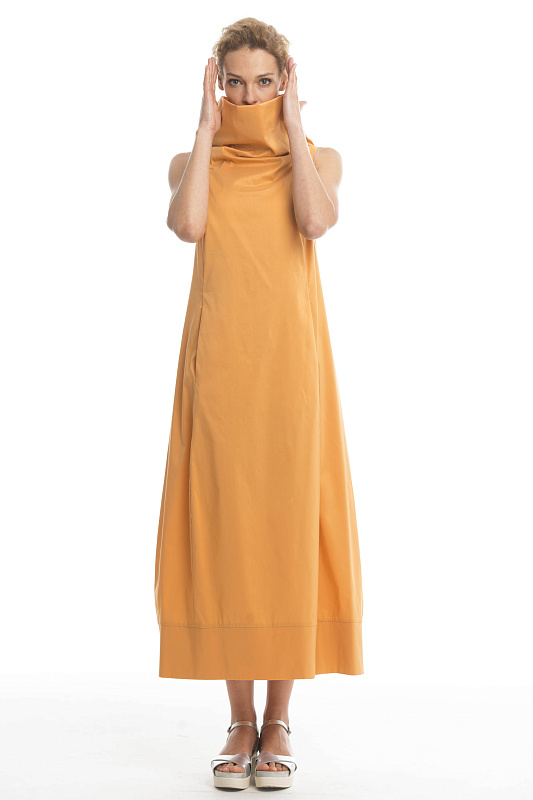Ворот-хомут - яркая, запоминающаяся деталь на этом длинном платье, скроенном трапецией. Каждый раз, когда вы надеваете платье, ворот за счет своего объема свободно ложиться по-разному, а значит, и вы будете каждый раз в этом платье выглядеть немного иначе