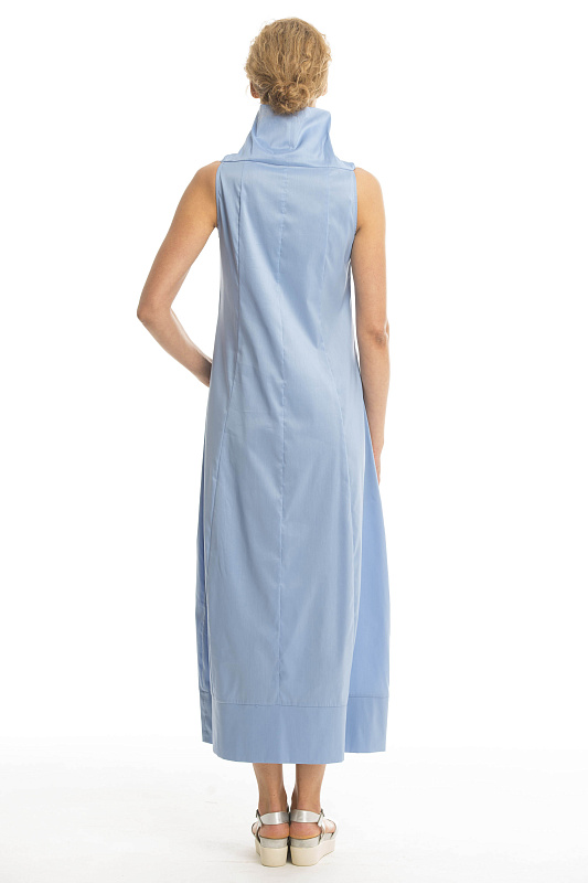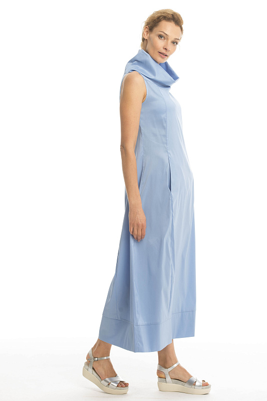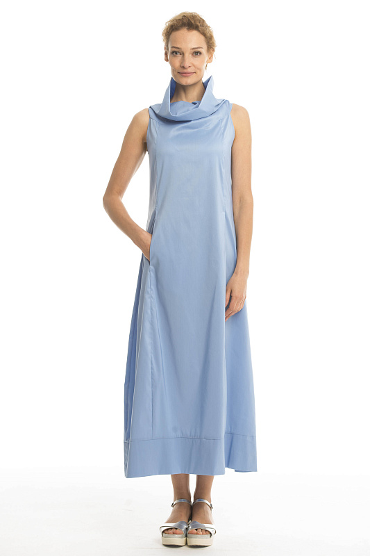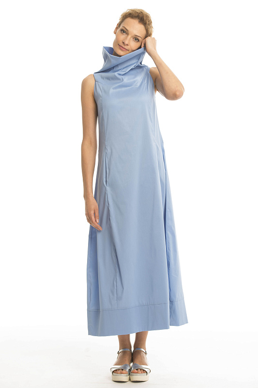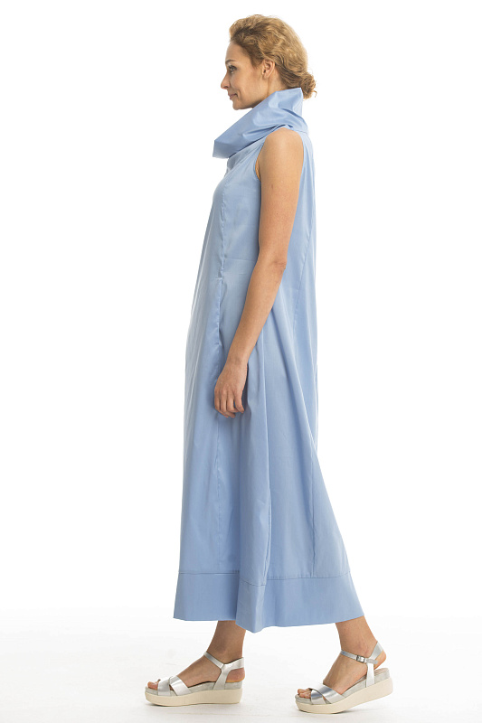 Ворот-хомут - яркая, запоминающаяся деталь на этом длинном платье, скроенном трапецией. Каждый раз, когда вы надеваете платье, ворот за счет своего объема свободно ложиться по-разному, а значит, и вы будете каждый раз в этом платье выглядеть немного иначе