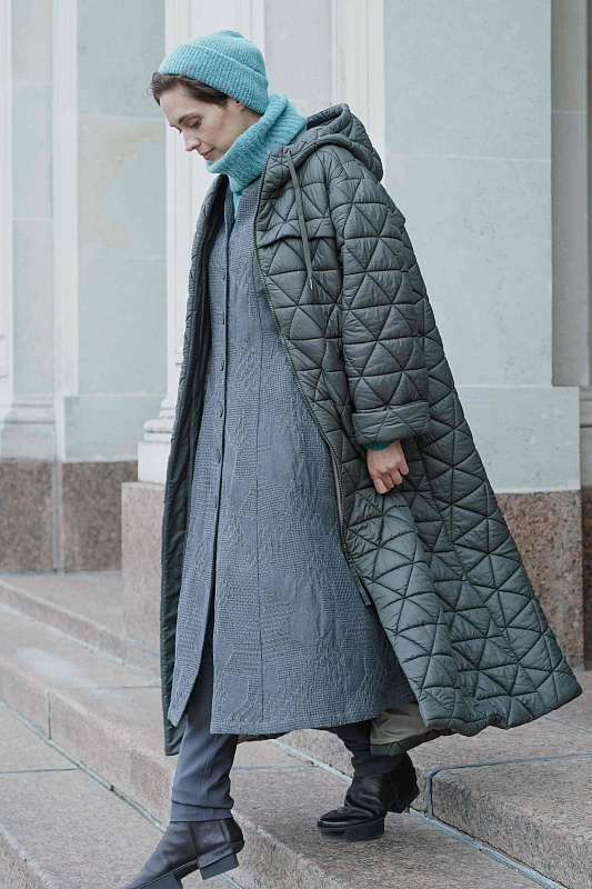Платье прямого силуэта на пуговицах из фактурного хлопкового жаккарда. V-образный вырез горловины открывает и визуально удлиняет шею.