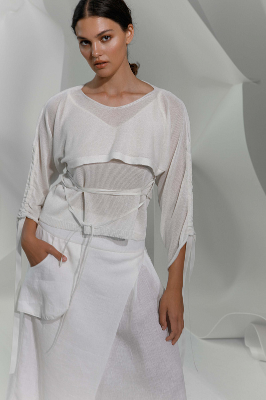Легкое укороченное болеро с коротким рукавом с драпировкой и эффектными завязками из декоративных лент разной толщины. С декоративными кольцами на талии. Полупрозрачное струящееся полотно. Модель выполнена из тонкой и нежной Итальянской вискозы с мерцающим блеском.