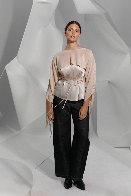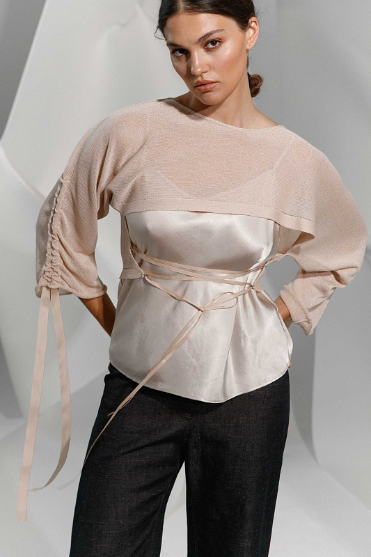 Легкое укороченное болеро с коротким рукавом с драпировкой и эффектными завязками из декоративных лент разной толщины. С декоративными кольцами на талии. Полупрозрачное струящееся полотно. Модель выполнена из тонкой и нежной Итальянской вискозы с мерцающим блеском.