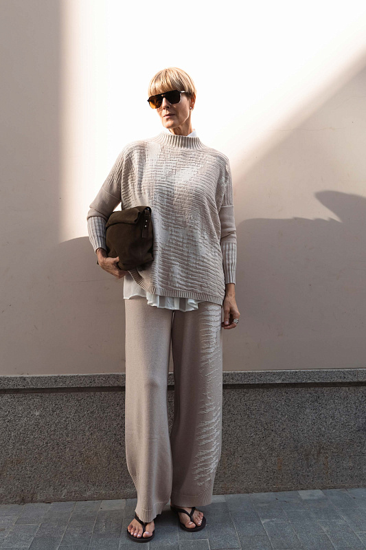 Вязаные брюки из нежной  вискозы с кашемиром.  Выполнены переплетением с абстрактным рисунком и резинкой по низу изделия, которая  придает изделию мягкость формы. Тонкое полотно делает изделие тактильно приятным.