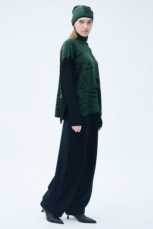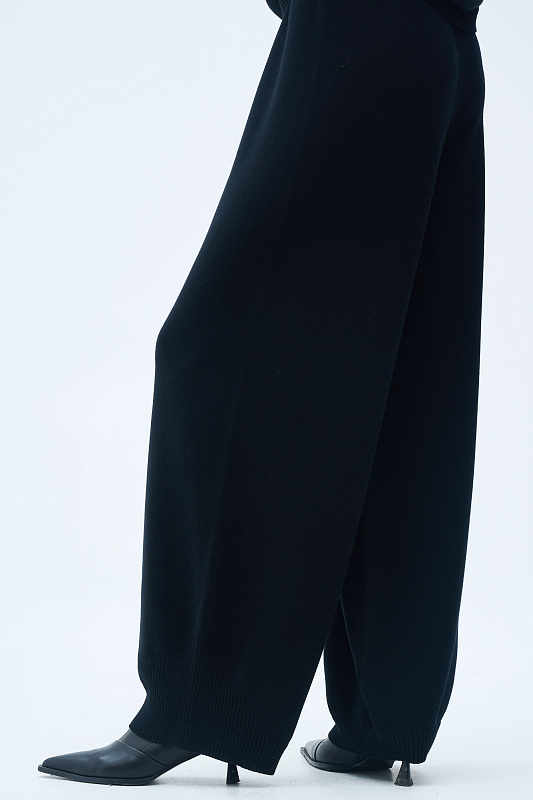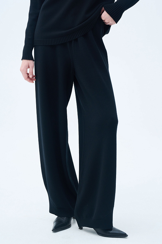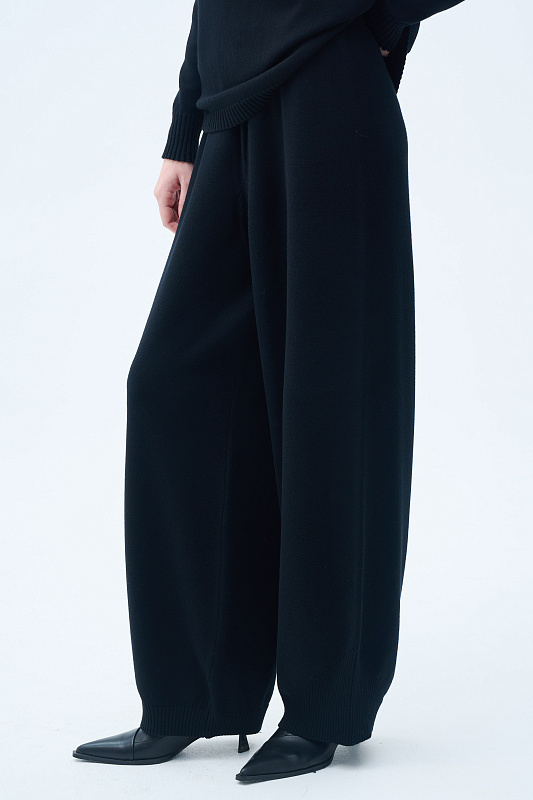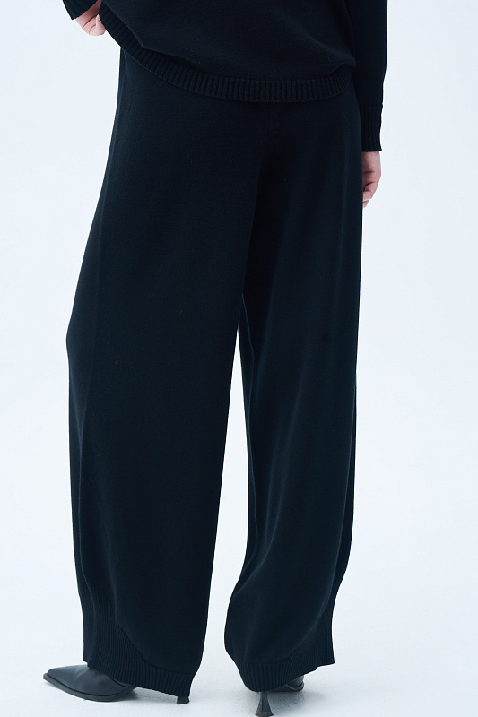 Вязаные брюки из нежной вискозы с кашемиром. Выполнены гладким однотонным переплетением и резинкой по низу изделия, которая придает изделию мягкость формы. Тонкое полотно делает изделие тактильно приятным.