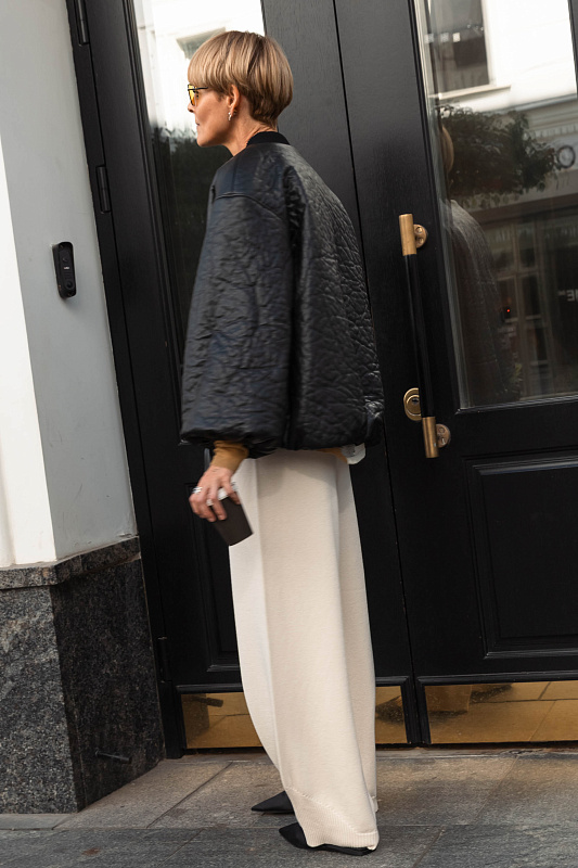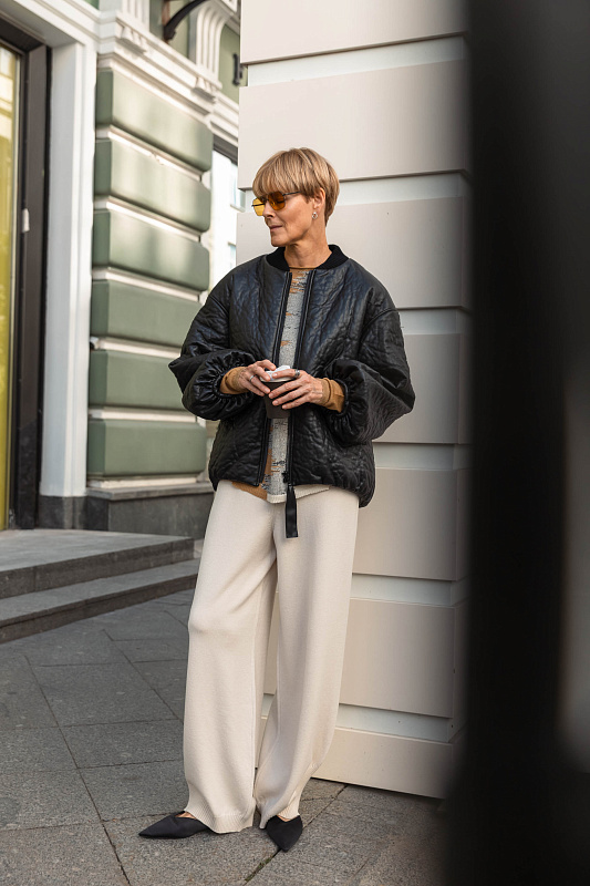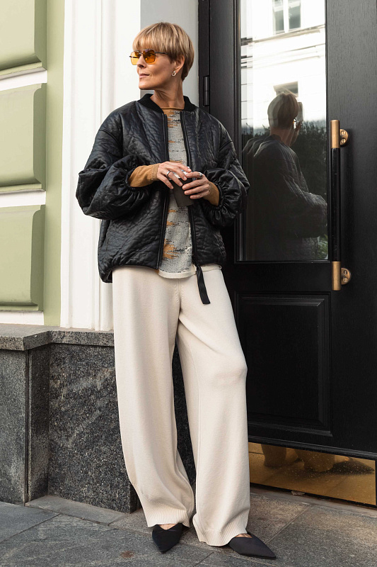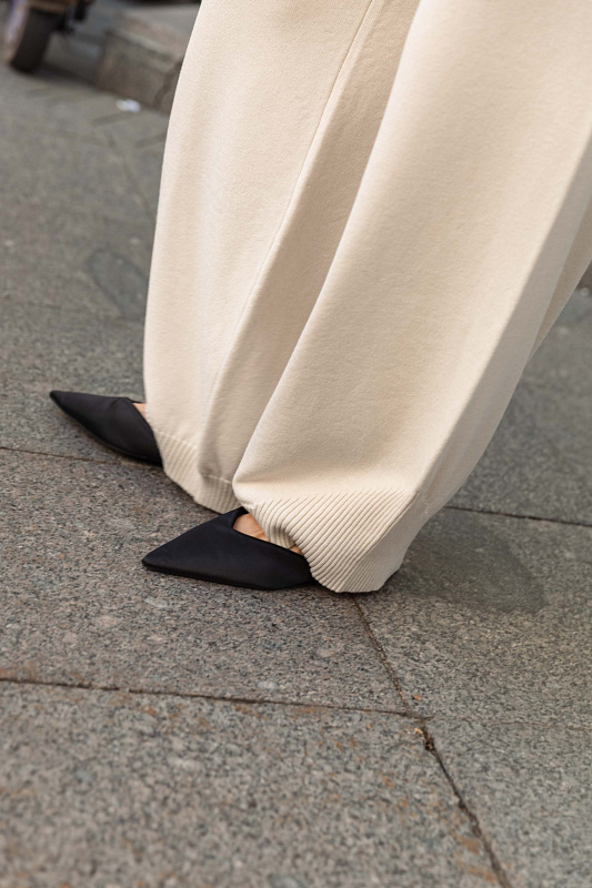Вязаные брюки из нежной вискозы с кашемиром. Выполнены гладким однотонным переплетением и резинкой по низу изделия, которая придает изделию мягкость формы. Тонкое полотно делает изделие тактильно приятным.