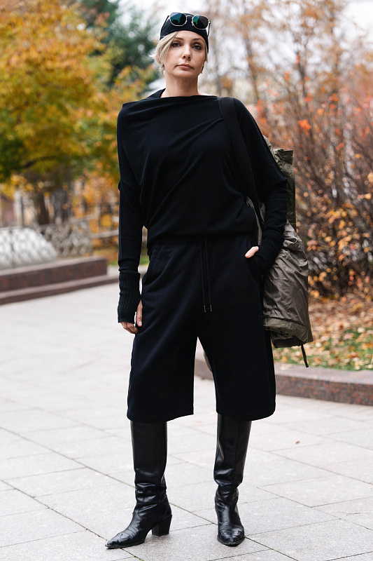 Вязаный джемпер тонкого вязания, асимметричной формы и силуэта, с длинным рукавом и мягкой горловиной. Возможна стилизация джемпера за счет изменения положения горловины: либо свободно, либо со сдвоенной стойкой на одно плечо.