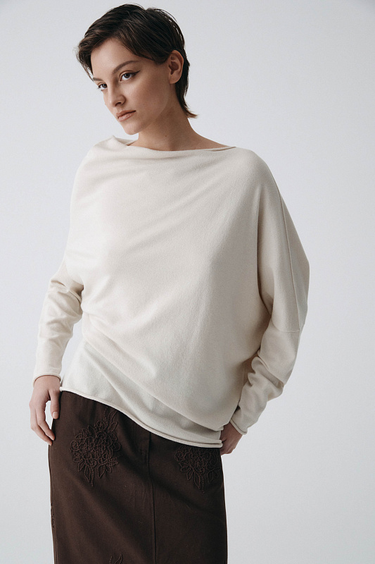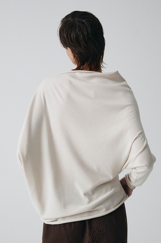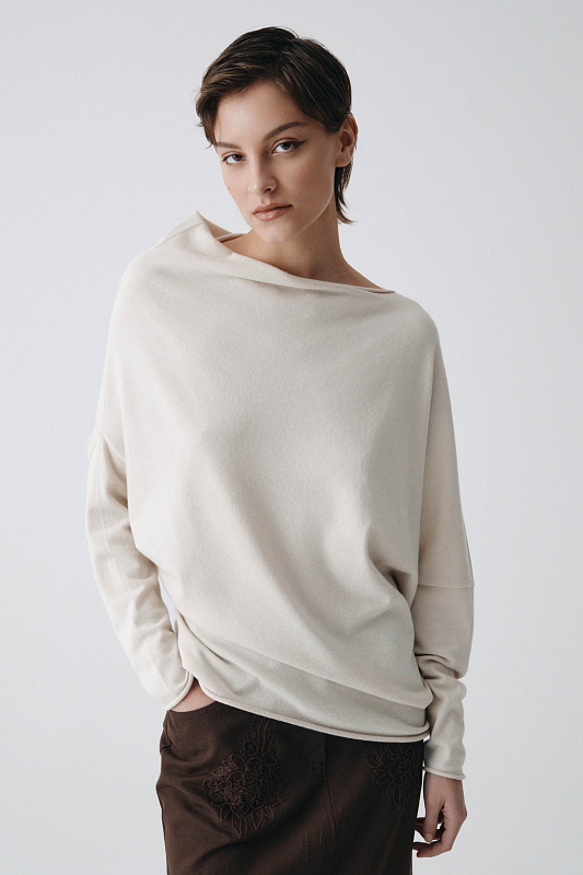 Вязаный джемпер тонкого вязания, асимметричной формы и силуэта, с длинным рукавом и мягкой горловиной. Возможна стилизация джемпера за счет изменения положения горловины: либо свободно, либо со сдвоенной стойкой на одно плечо.