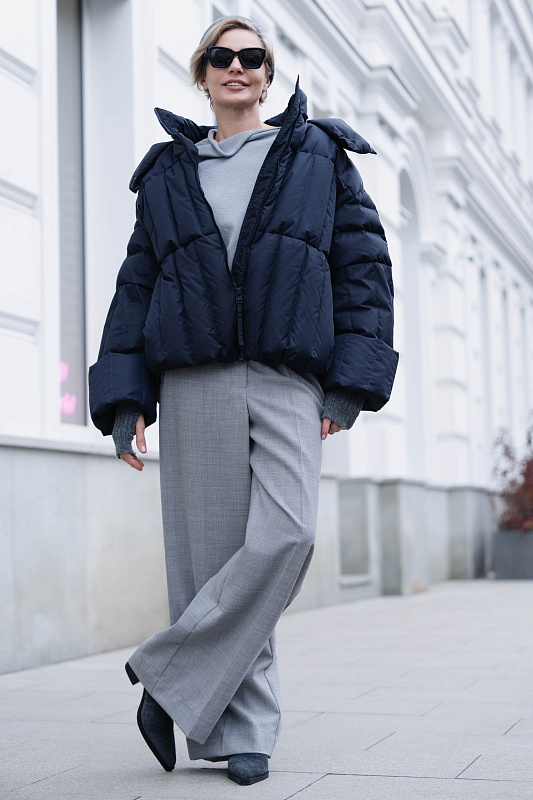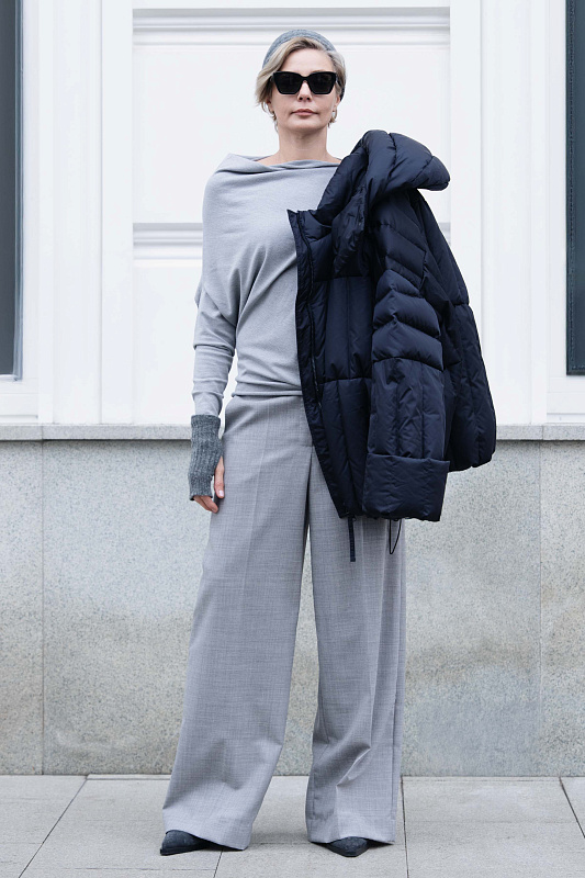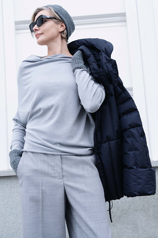 Вязаный джемпер тонкого вязания, асимметричной формы и силуэта, с длинным рукавом и мягкой горловиной. Возможна стилизация джемпера за счет изменения положения горловины: либо свободно, либо со сдвоенной стойкой на одно плечо.
