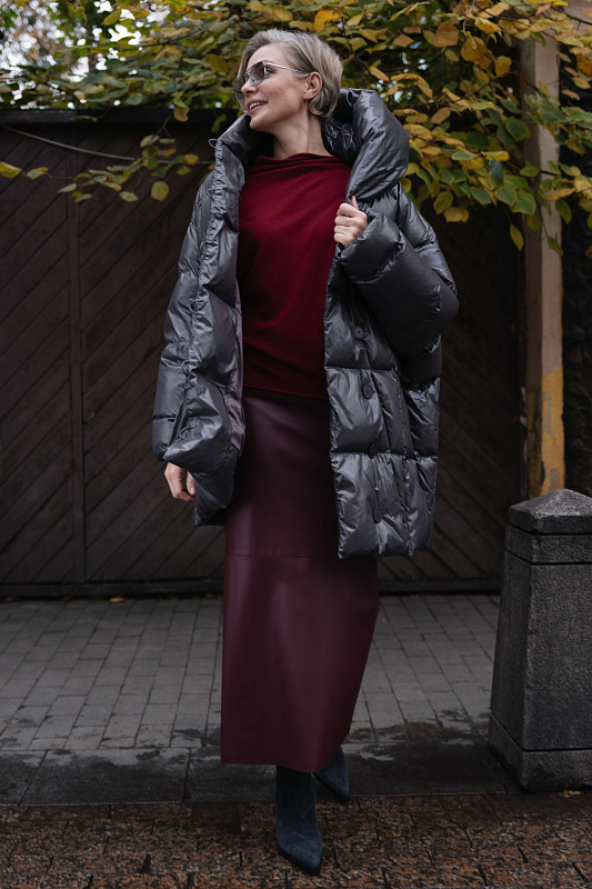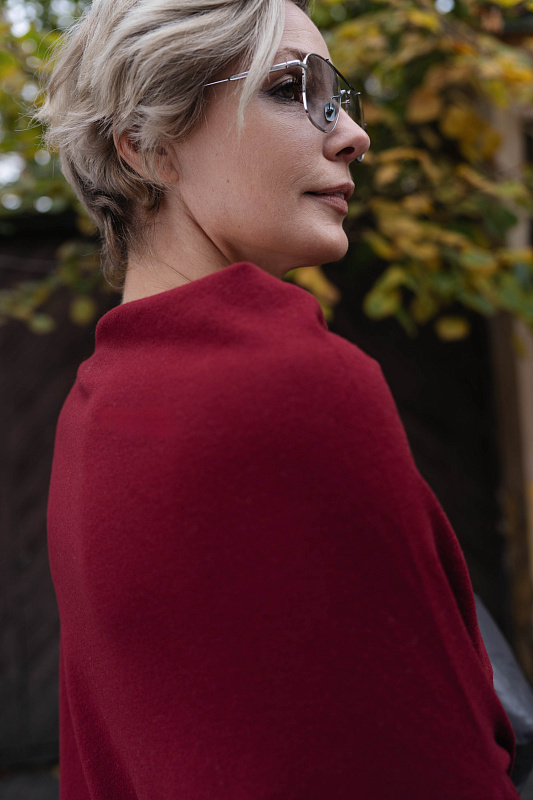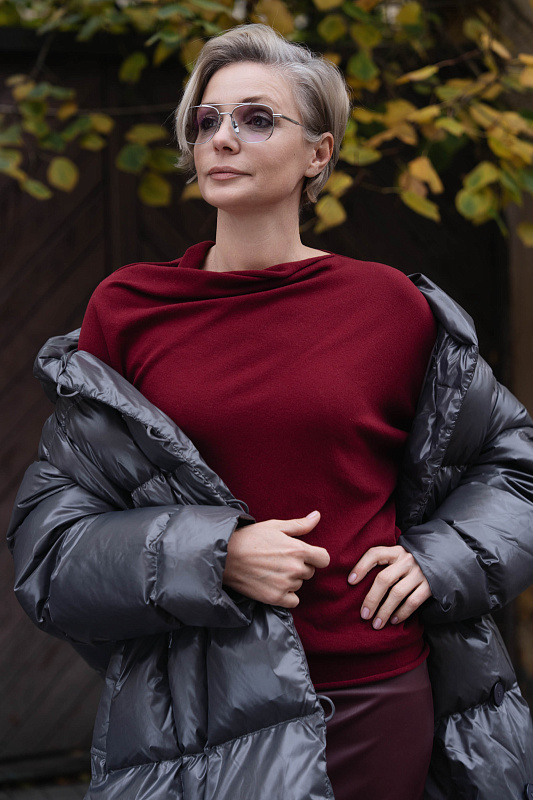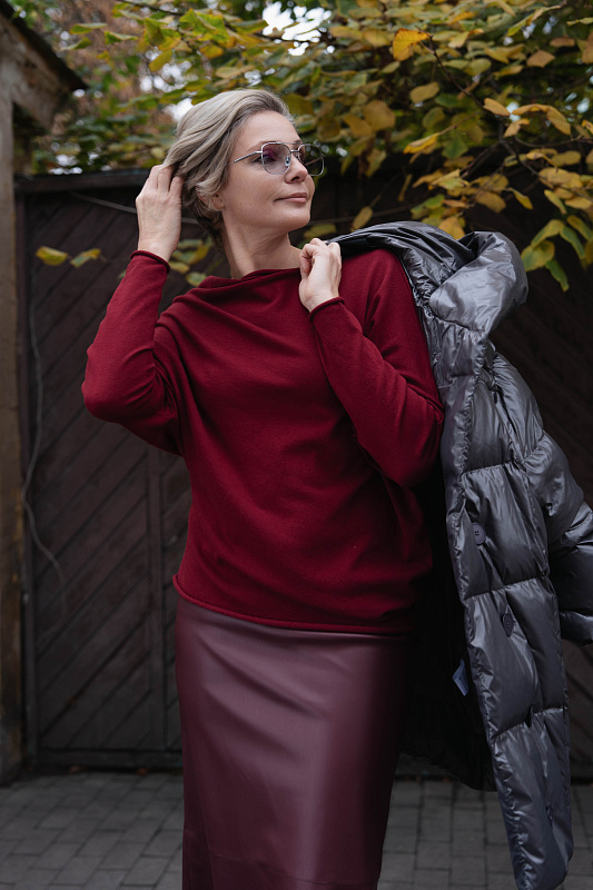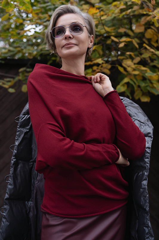 Вязаный джемпер тонкого вязания, асимметричной формы и силуэта, с длинным рукавом и мягкой горловиной. Возможна стилизация джемпера за счет изменения положения горловины: либо свободно, либо со сдвоенной стойкой на одно плечо.