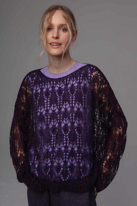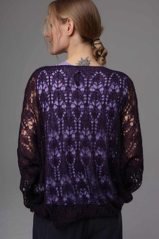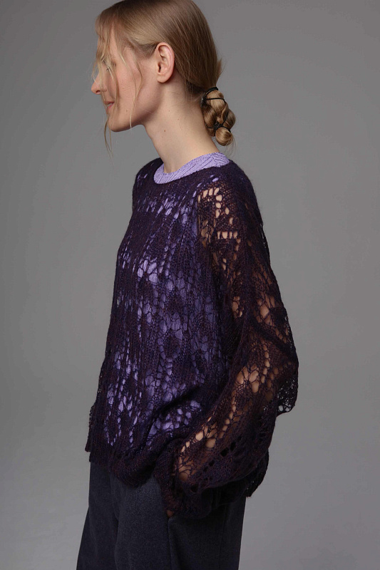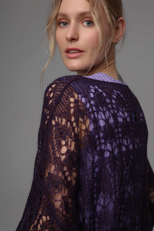 Легкий вязаный джемпер - паутинка расслабленного прямого силуэта, полупрозрачной текстуры с ажурным узором. С длинным рукавом и горловиной – лодочка, которая позволяет стилизовать изделие поверх рубашки или водолазки. Выполнен из итальянской пряжи меланжированного мягкого мохера.