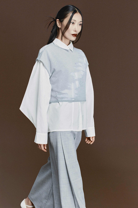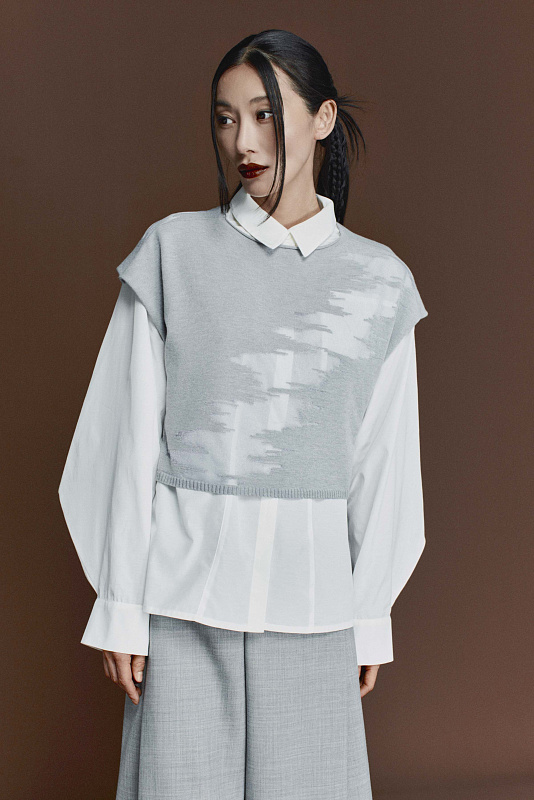 Вязаный джемпер жилет тонкого вязания , прямого силуэта с коротким рукавом и  круглой горловиной. По бокам разрезы. С полупрозрачным эффектным вуалевым рисунком по стану изделия.