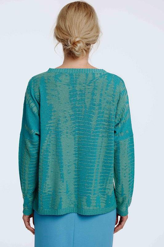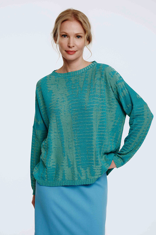 Вязаный джемпер с длинным рукавом прямого силуэта с вывязанным структурным рисунком. Выполнен на контрасте глянцевой вискозы в сочетании с матовой крепированной вискозой, волокна которой имеют интересный волнообразный вид. Спущенная линия плеча, круглый вырез горловины. Модель в едином размере.