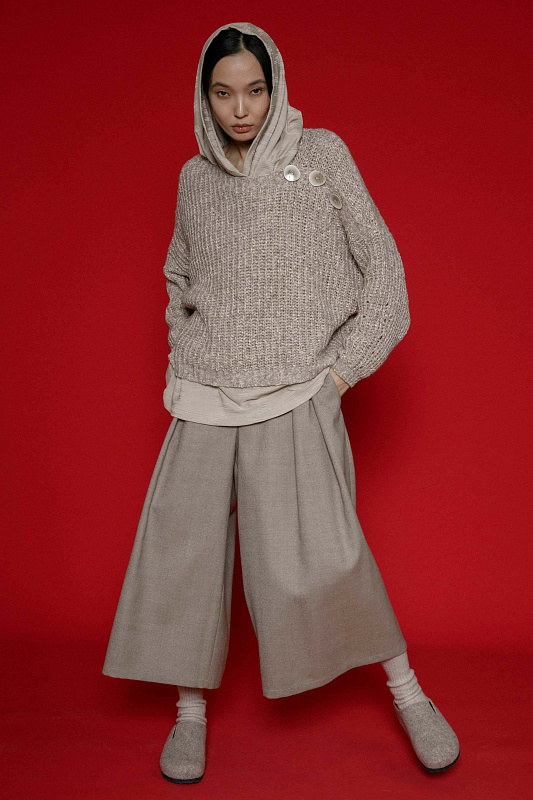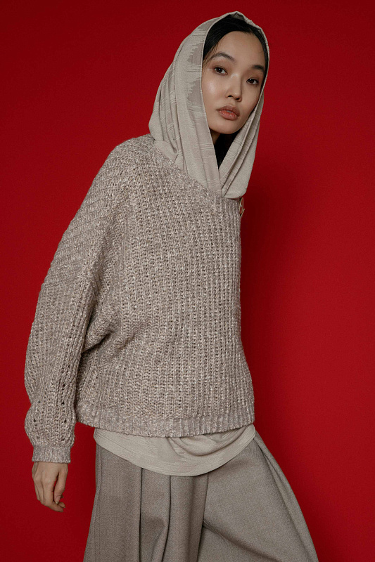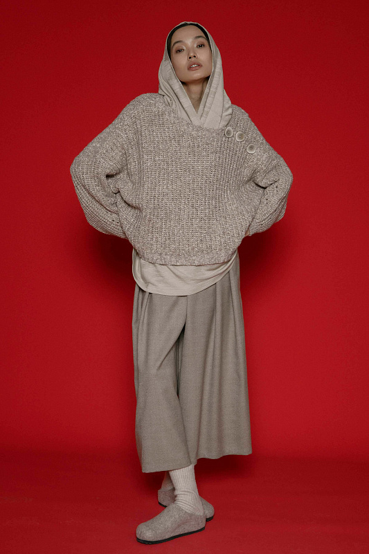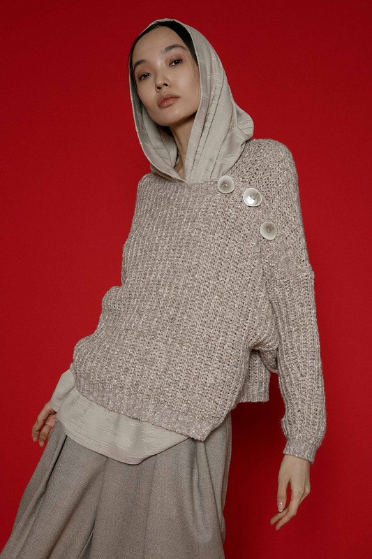 Вязаный джемпер фактурной объемной вязки с планкой с пуговицами по плечу. Асимметричный вырез горловины, прямой силуэт, объемные рукава на манжете-резинке. Выполнен из пряжи с меланжевым эффектом.