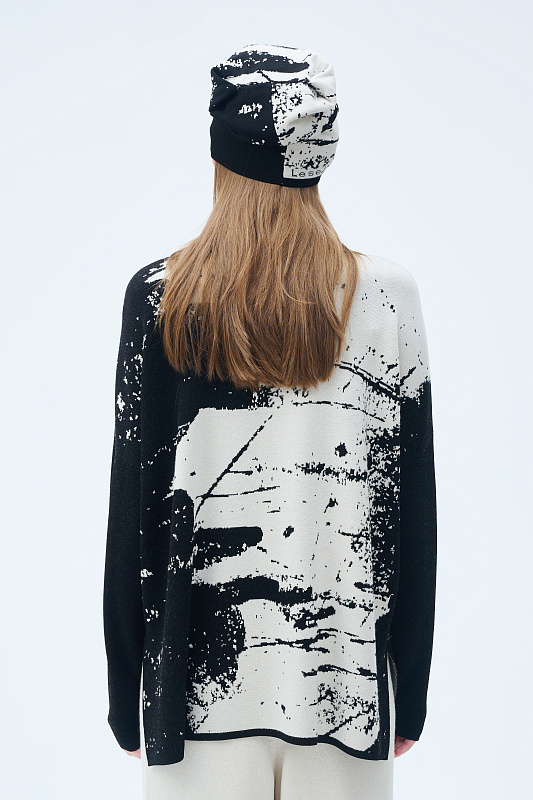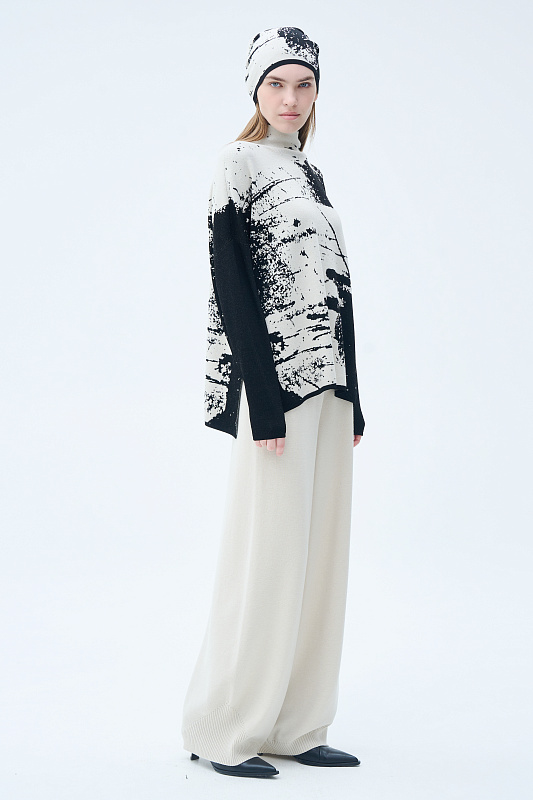 Вязаный гладкий джемпер прямого силуэта с горловиной стойкой с разрезами по бокам. Выполнен на контрасте матовой текстуры вискозы с кашемиром и глянцевой вискозы жаккардовым переплетением в виде графического рисунка.