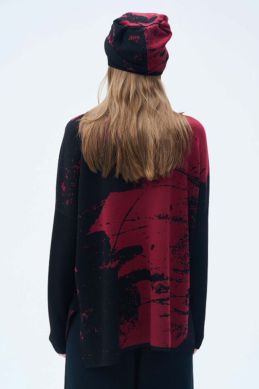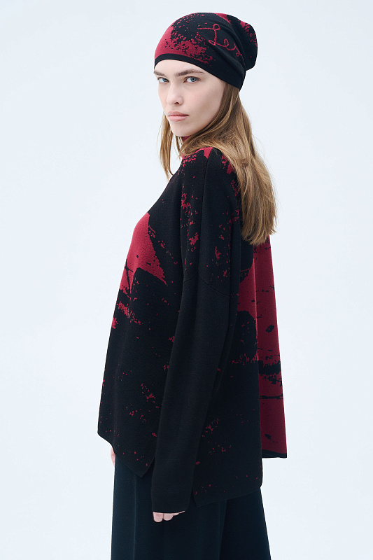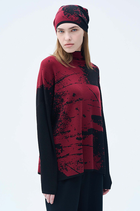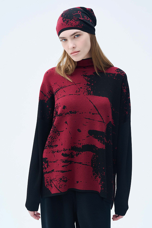 Вязаный гладкий джемпер прямого силуэта с горловиной стойкой с разрезами по бокам. Выполнен на контрасте матовой текстуры вискозы с кашемиром и глянцевой вискозы жаккардовым переплетением в виде графического рисунка.