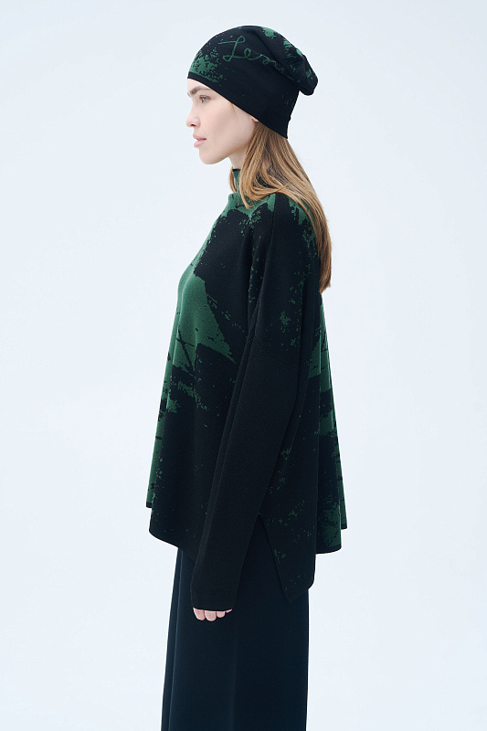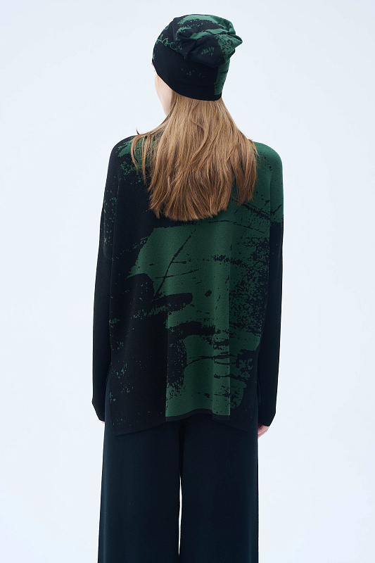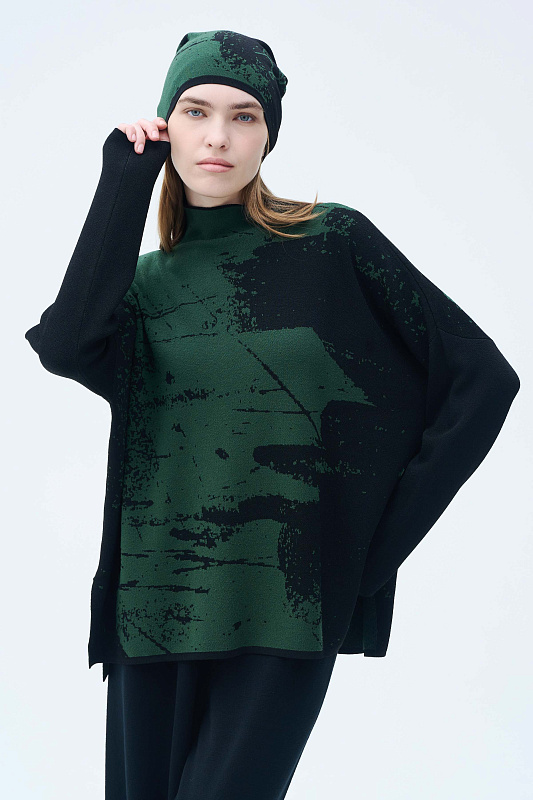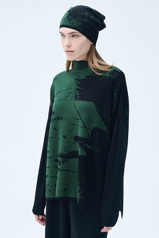 Вязаный гладкий джемпер прямого силуэта с горловиной стойкой с разрезами по бокам. Выполнен на контрасте матовой текстуры вискозы с кашемиром и глянцевой вискозы жаккардовым переплетением в виде графического рисунка.