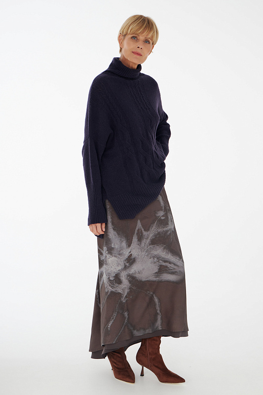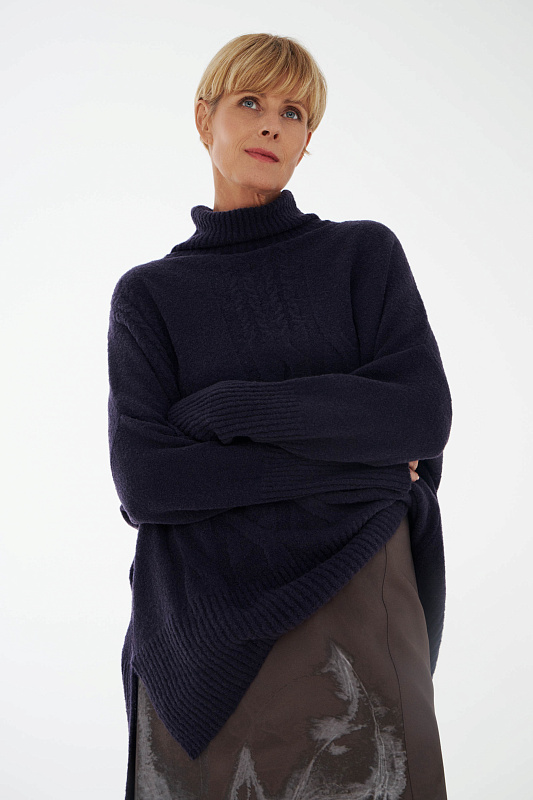Вязаный джемпер расслабленного прямого силуэта с разрезами по бокам и удлиненной спинкой, с длинным рукавом и горловиной – стойкой. Выполнен из не теряющей своей актуальности переплетения с косами, которое образует объемный и неравномерный эффект.