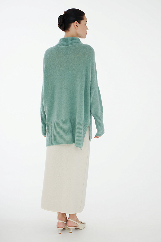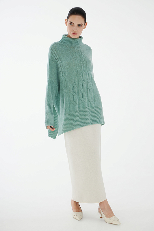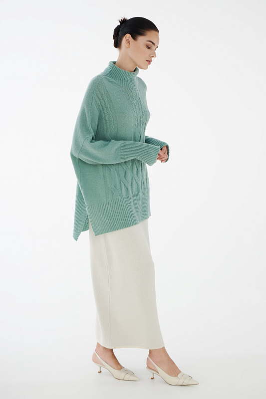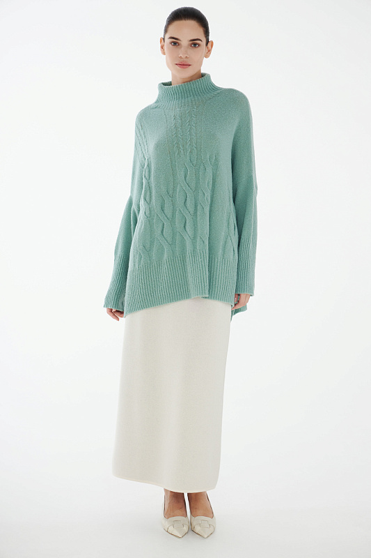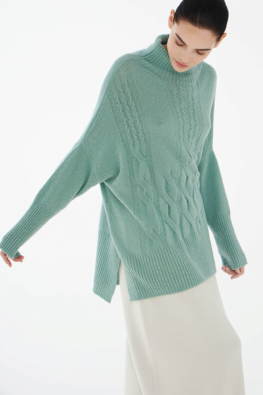 Вязаный джемпер расслабленного прямого силуэта с разрезами по бокам и удлиненной спинкой, с длинным рукавом и горловиной – стойкой. Выполнен из не теряющей своей актуальности переплетения с косами, которое образует объемный и неравномерный эффект.