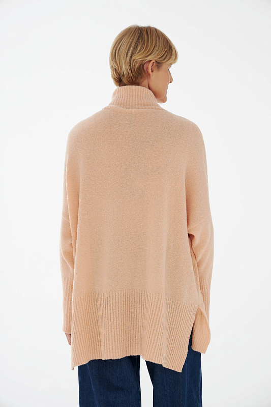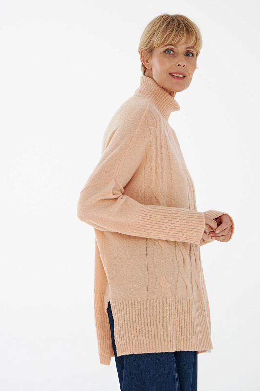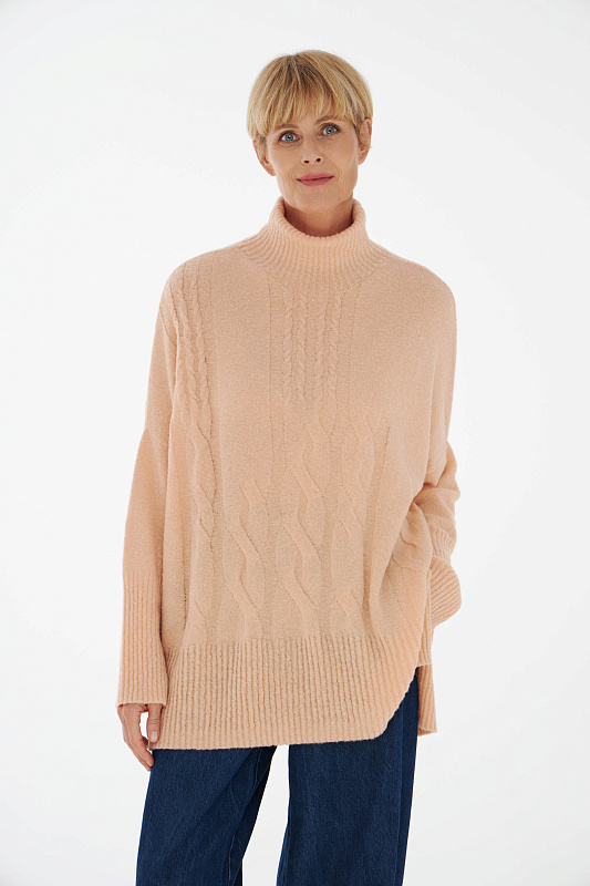 Вязаный джемпер расслабленного прямого силуэта с разрезами по бокам и удлиненной спинкой, с длинным рукавом и горловиной – стойкой. Выполнен из не теряющей своей актуальности переплетения с косами, которое образует объемный и неравномерный эффект.