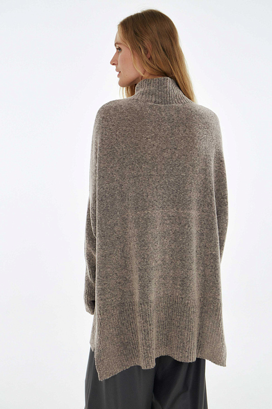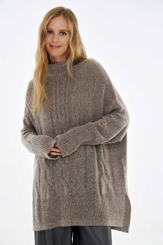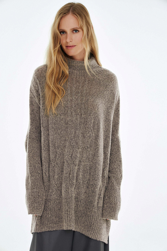 Вязаный джемпер расслабленного прямого силуэта с разрезами по бокам и удлиненной спинкой, с длинным рукавом и горловиной – стойкой. Выполнен из не теряющей своей актуальности переплетения с косами, которое образует объемный и неравномерный эффект.