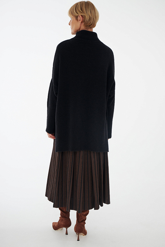Вязаный джемпер расслабленного прямого силуэта с разрезами по бокам и удлиненной спинкой, с длинным рукавом и горловиной – стойкой. Выполнен из не теряющей своей актуальности переплетения с косами, которое образует объемный и неравномерный эффект.