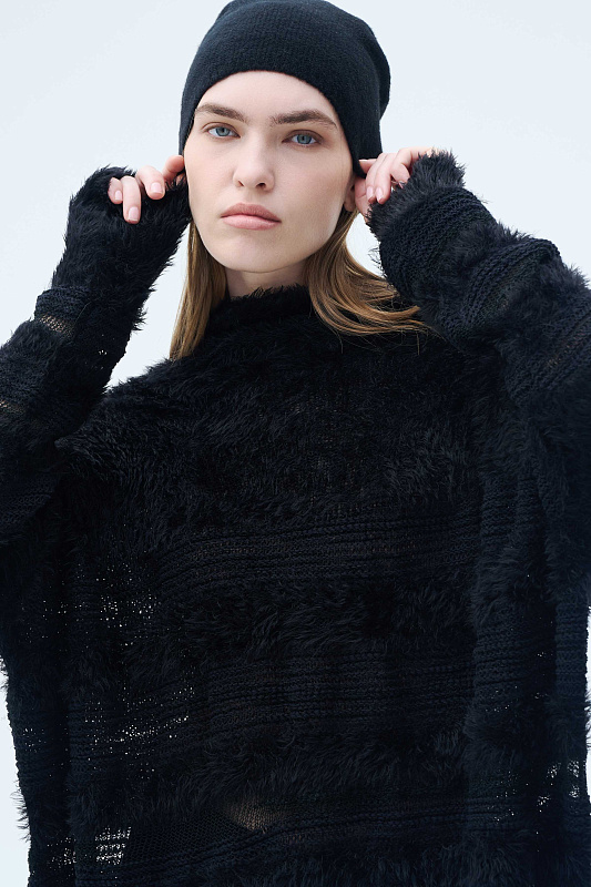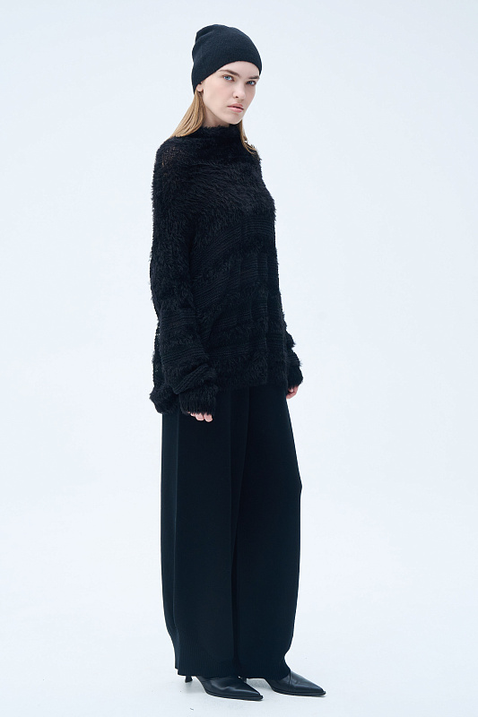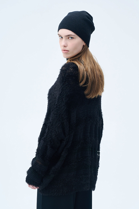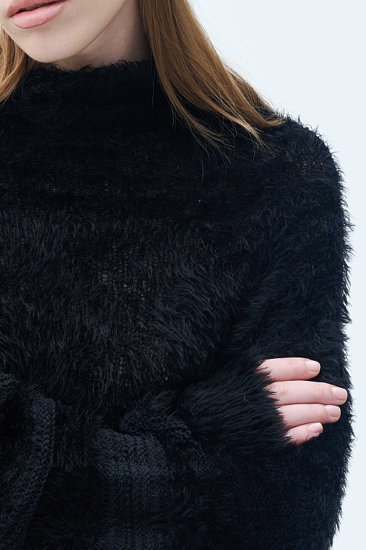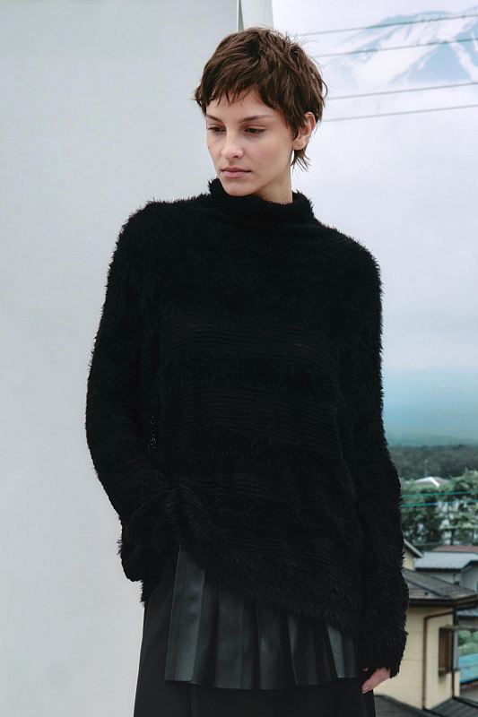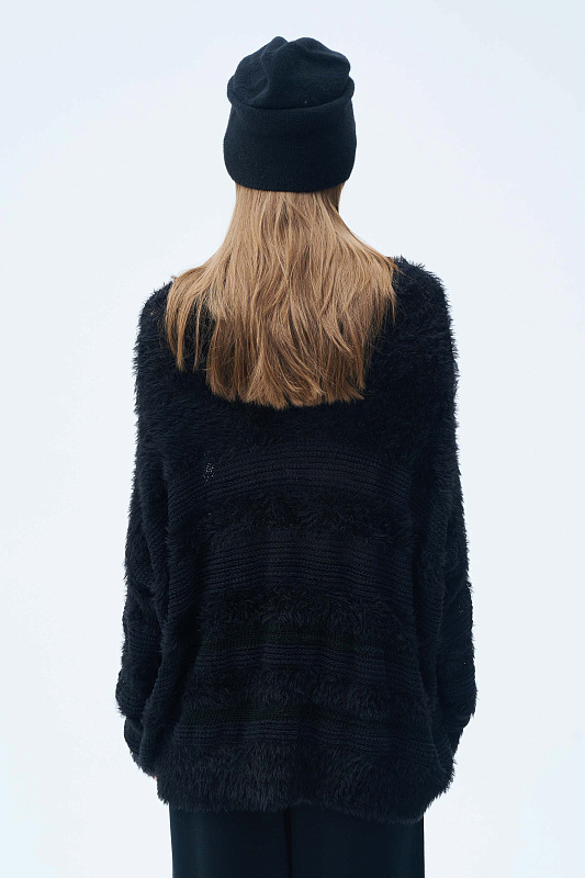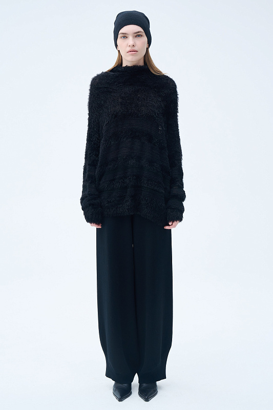Вязаный джемпер удлиненного свободного силуэта из пушистой пряжи с длинным ворсом с рисунком в виде полос из различных комбинаций пряж. Спущенная линия плеча, воротник-хомут.