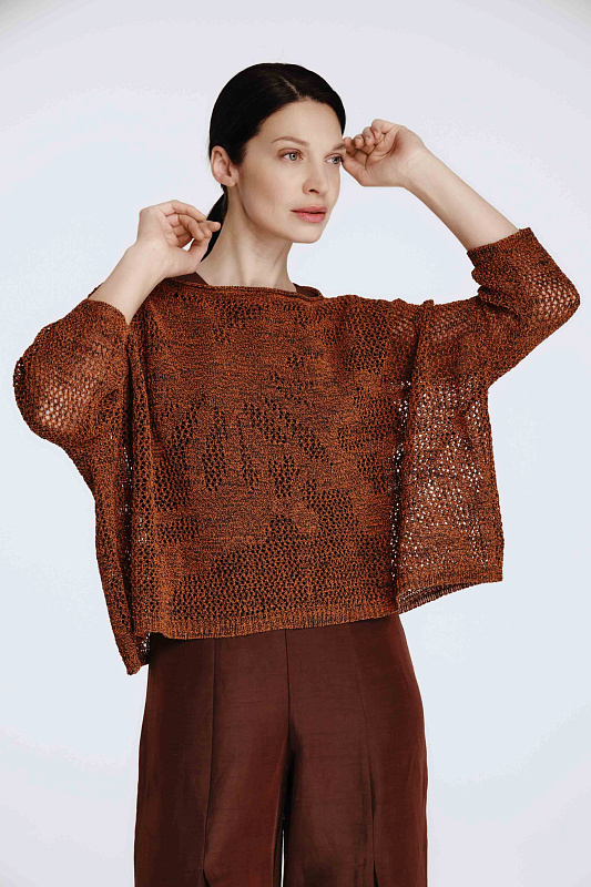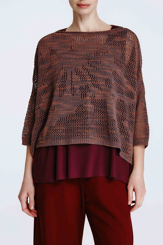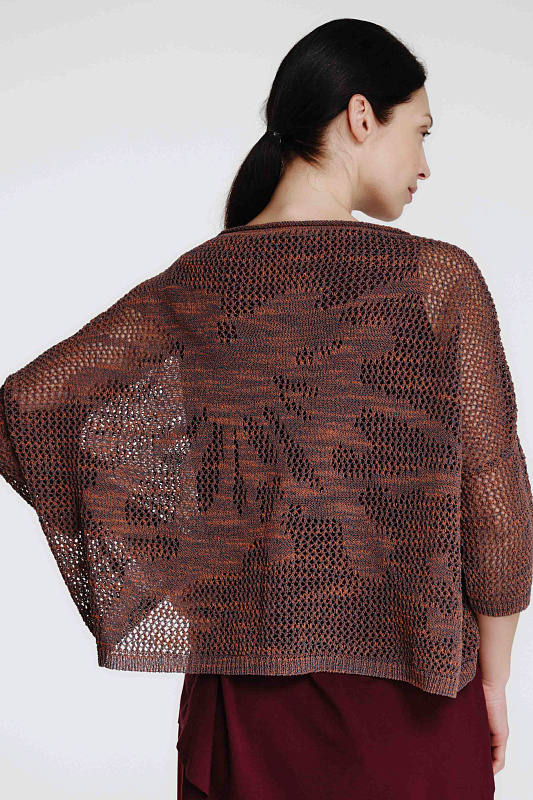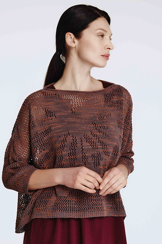 Новая интерпретация сетчатого узора вязаного джемпера с рукавом средней длины. Чередование пустых и плотных участков в полотне модели подчеркивает легкость изделия, а вид натуральных волокон придает особенный эффект меланжированной пряжи.