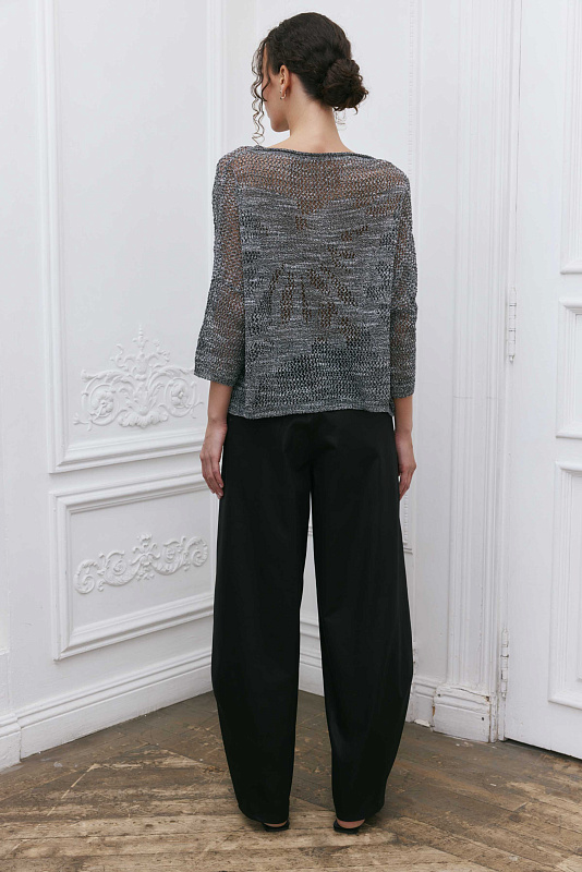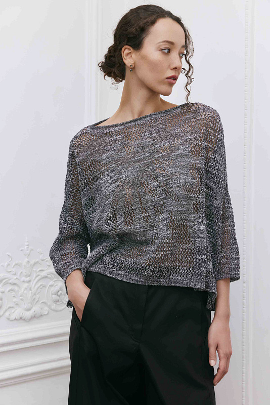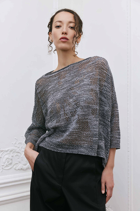 Новая интерпретация сетчатого узора вязаного джемпера с рукавом средней длины. Чередование пустых и плотных участков в полотне модели подчеркивает легкость изделия, а вид натуральных волокон придает особенный эффект меланжированной пряжи.
