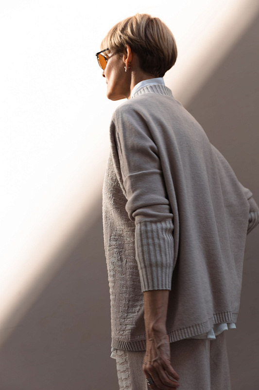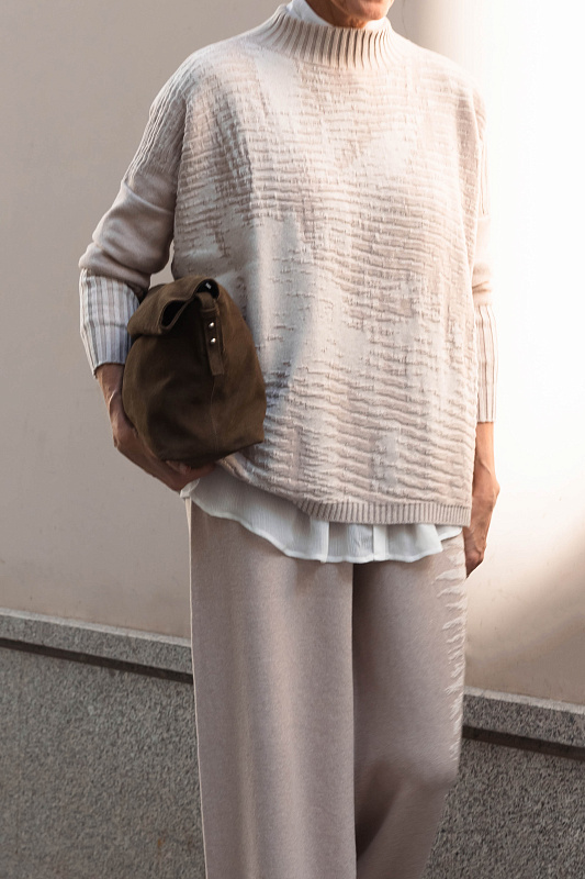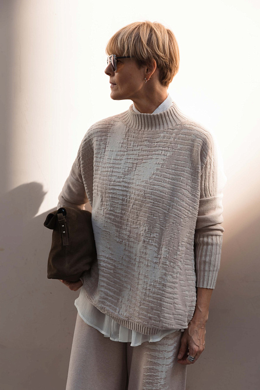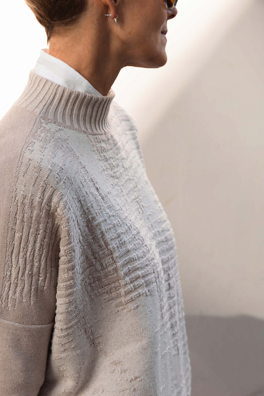 Вязаный джемпер с воротником- стойкой типа водолазки из нежной вискозы с кашемиром. Выполнен переплетением с абстрактным рисунком. Тонкое полотно делает изделие тактильно приятным.