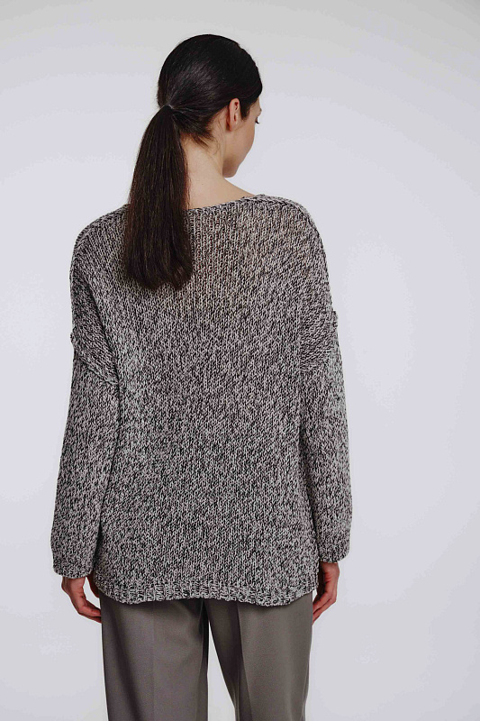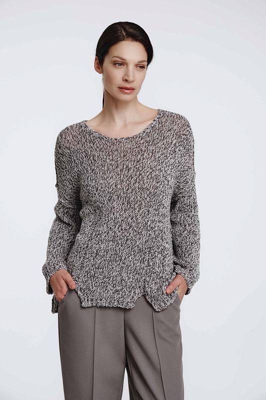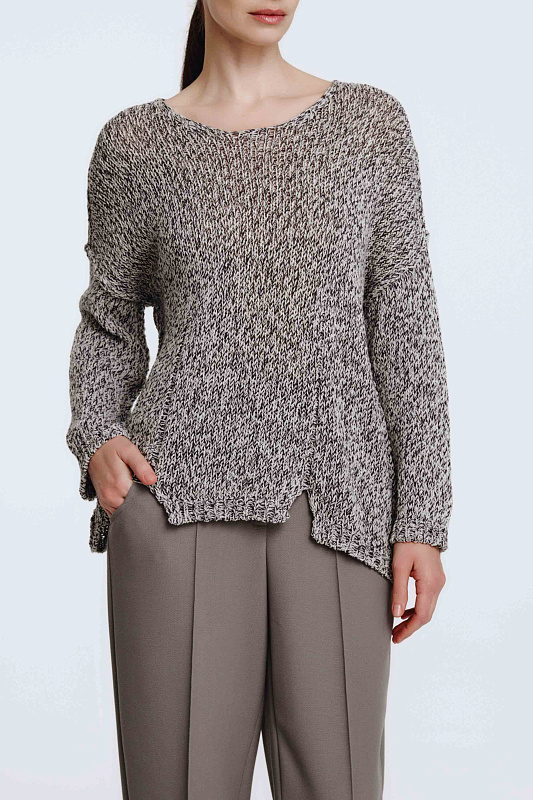 Вязаный джемпер с длинным рукавом расслабленного силуэта с вывязанными асимметричными рельефами и разрезами по полочке изделия и круглой горловиной. Выполнен из итальянской фантазийной 2-х цветной пряжи, скрученной в технике Мулине.