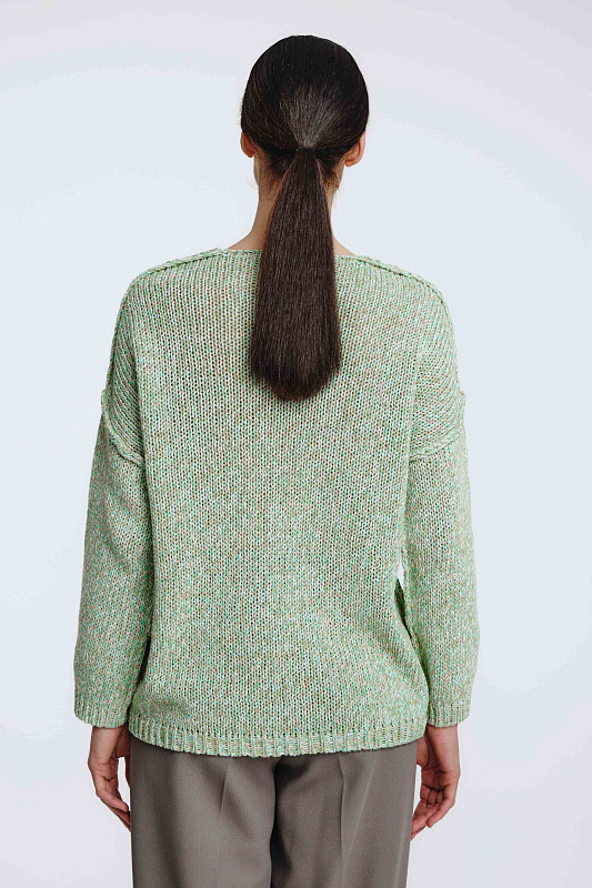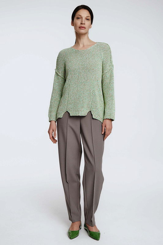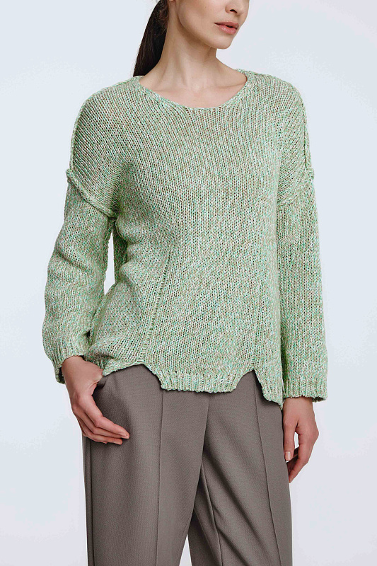 Вязаный джемпер с длинным рукавом расслабленного силуэта с вывязанными асимметричными рельефами и разрезами по полочке изделия и круглой горловиной. Выполнен из итальянской фантазийной 2-х цветной пряжи, скрученной в технике Мулине.
