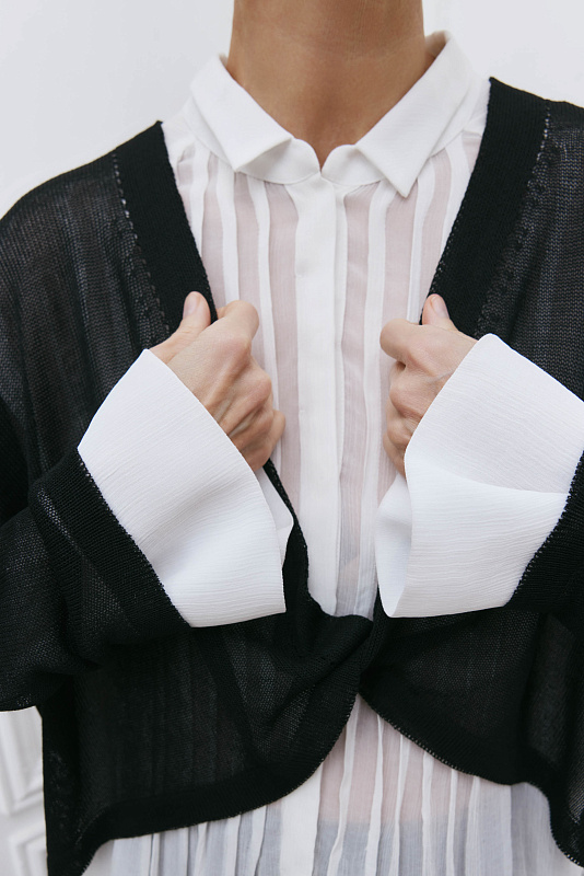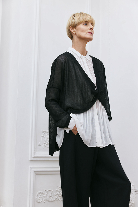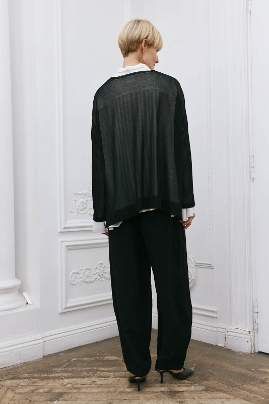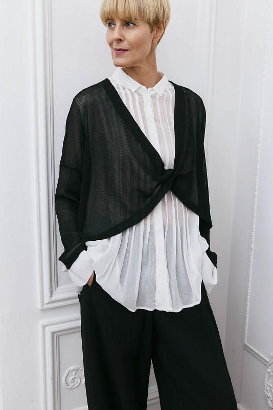 Вязаный джемпер из тонкого и струящегося полотна с длинным рукавом. Особенностью модели является дизайн в виде перекрученной части полочки, переходящей в V-образную горловину.
