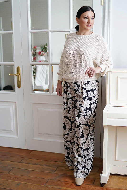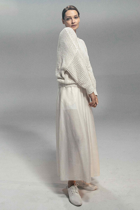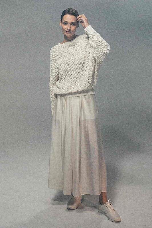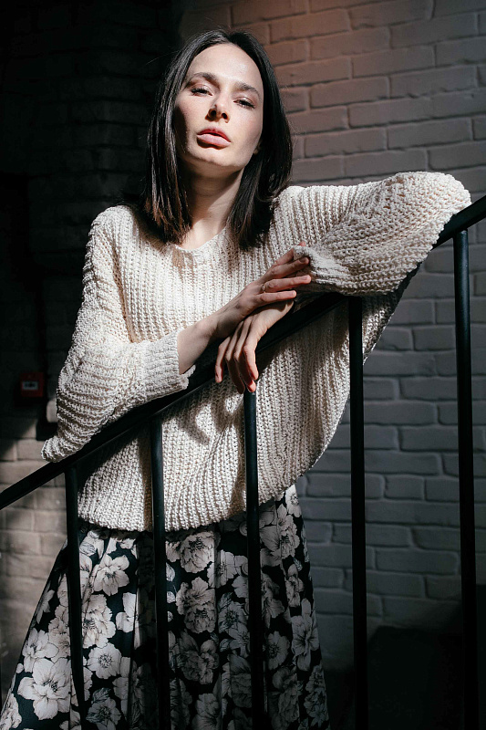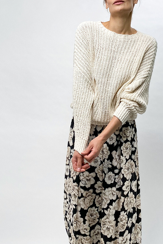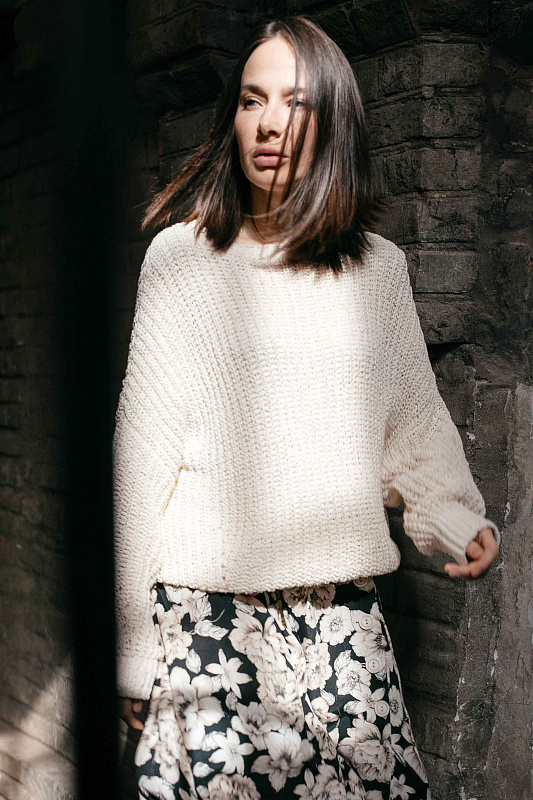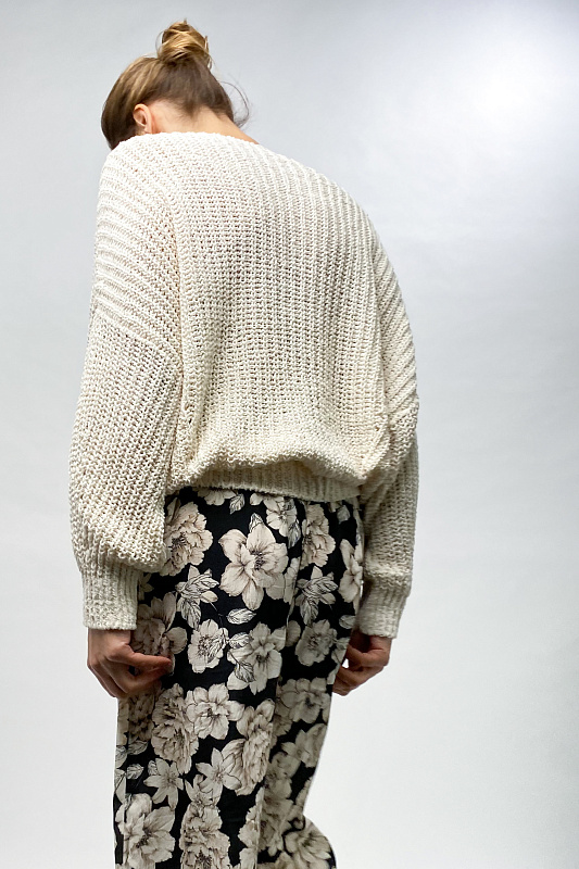 Объемный хлопковый джемпер с длинными рукавами выполнен в технике жемчужной резинки или полуфанг. Низ изделия и рукава на резинке.